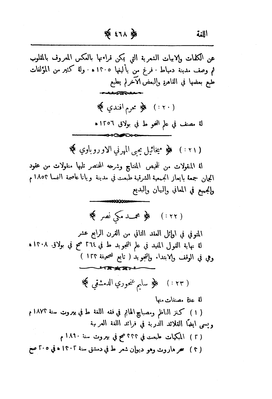 عن الكلمات والابيات الشعرية التي يمكن قراءتها بالعكس المعروف بالمقلوب ثم وصف مدينة دمياط. فرغ من تأليفها 1305هـ وله كثير من المؤلفات طبع بعضها في القاهرة والبعض الآخر لم يطبع