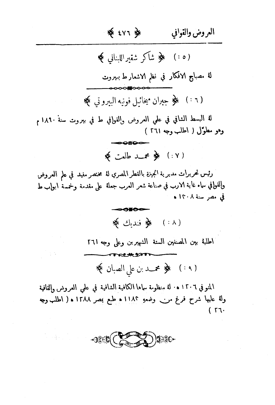 رئيس تحريرات مديرية الجيزة بالقطر المصري له مختصر مفيد في علم العروض والقوافي سماه غاية الارب في صناعة شعر العرب جعله على مقدمة وخمسة ابواب طبع في مصر سنة 1308هـ
