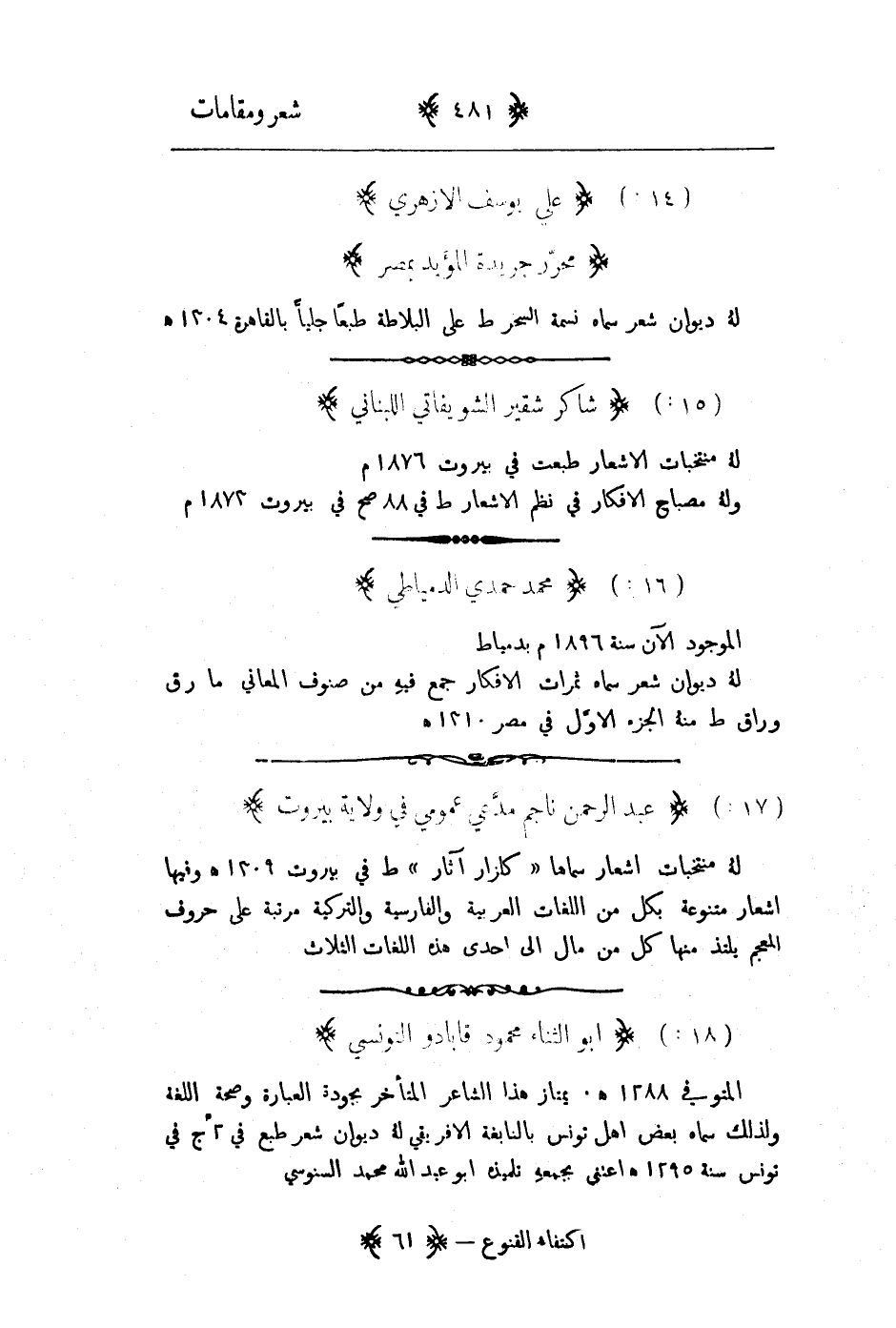 الموجود الان سنة 1896م بدمياط له ديوان شعر سماه ثمرات الافكار جمع فيه من صنوف المعاني ما رق وراق طبع منه الجزء الاول في مصر 1310هـ