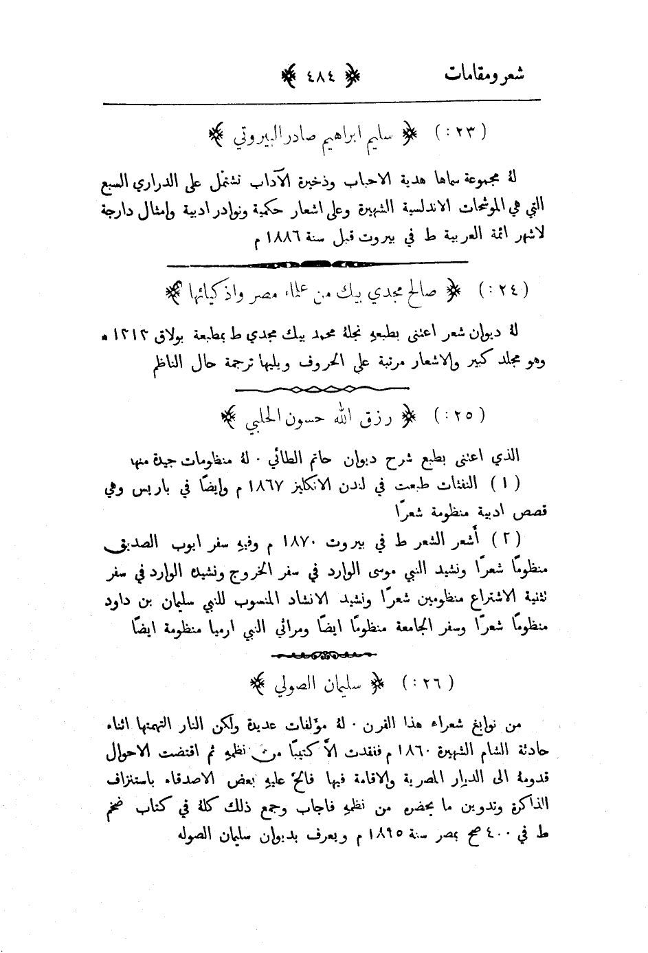 من نوابغ شعراء هذا القرن. له مؤلفات عديدة ولكن النار التهمتها اثناء حادثة الشام الشهيرة 1860م ففقدت إلا كتيباً من نظمه ثم اقتضت الاحوال قدومه الى الديار المصرية والاقامة فيها فالح عليه بعض الاصدقاء باستنزاف الذاكرة وتدوين ما يحضره من نظمه فاجاب وجمع ذلك كله في كتاب ضخم طبع في 400صح بمصر سنة 1895م ويعرف بديوان سليمان الصوله