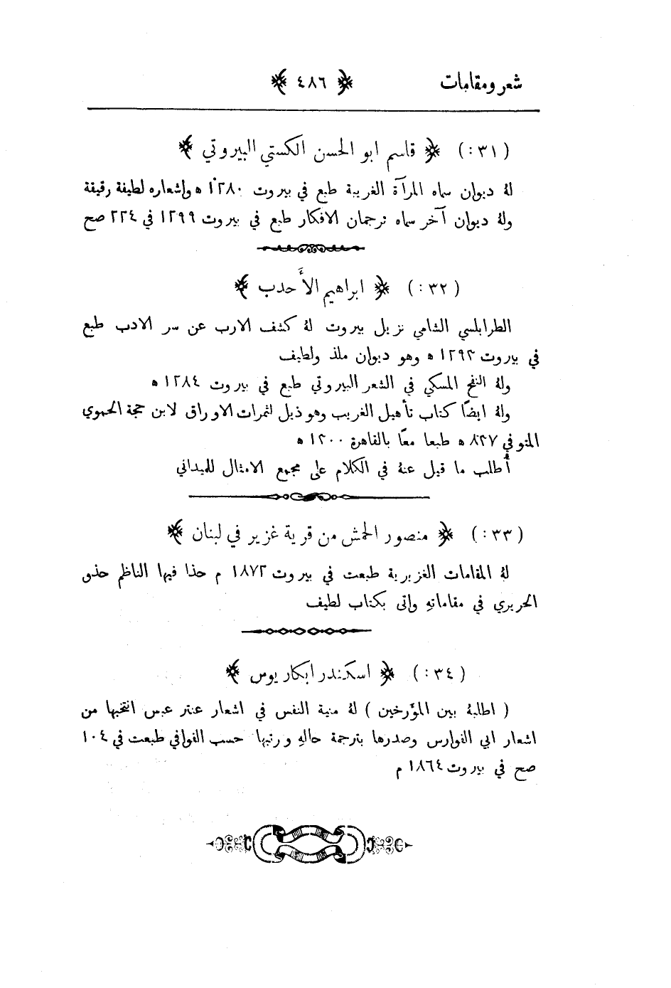 الطرابلسي الشامي نزيل بيروت له كشف الارب عن سر الادب طبع في بيروت 1293هـ وهو ديوان ملذ ولطيف وله النفح المسكي في الشعر البيروتي طبع في بيروت 1284هـ وله أيضاً كتاب تأهيل الغريب وهو ذيل لثمرات الاوراق لابن حجة الحموي المتوفى 837هـ طبعا معاً بالقاهرة 1300هـ اطلب ما قيل عنه في الكلام على مجمع الامثال للميداني