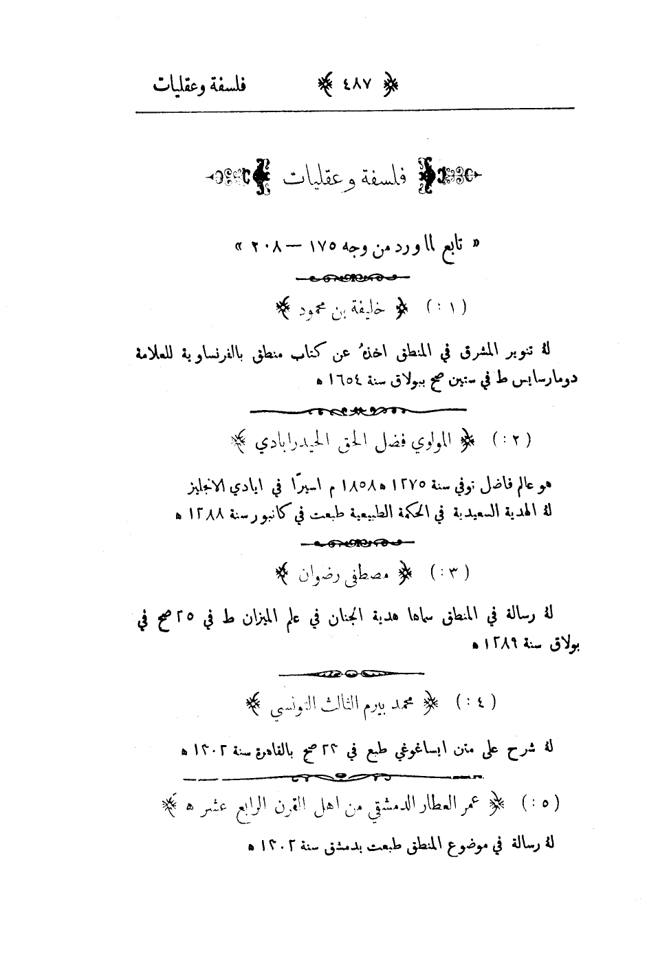 له رسالة في موضوع المنطق طبعت بدمشق سنة 1302هـ