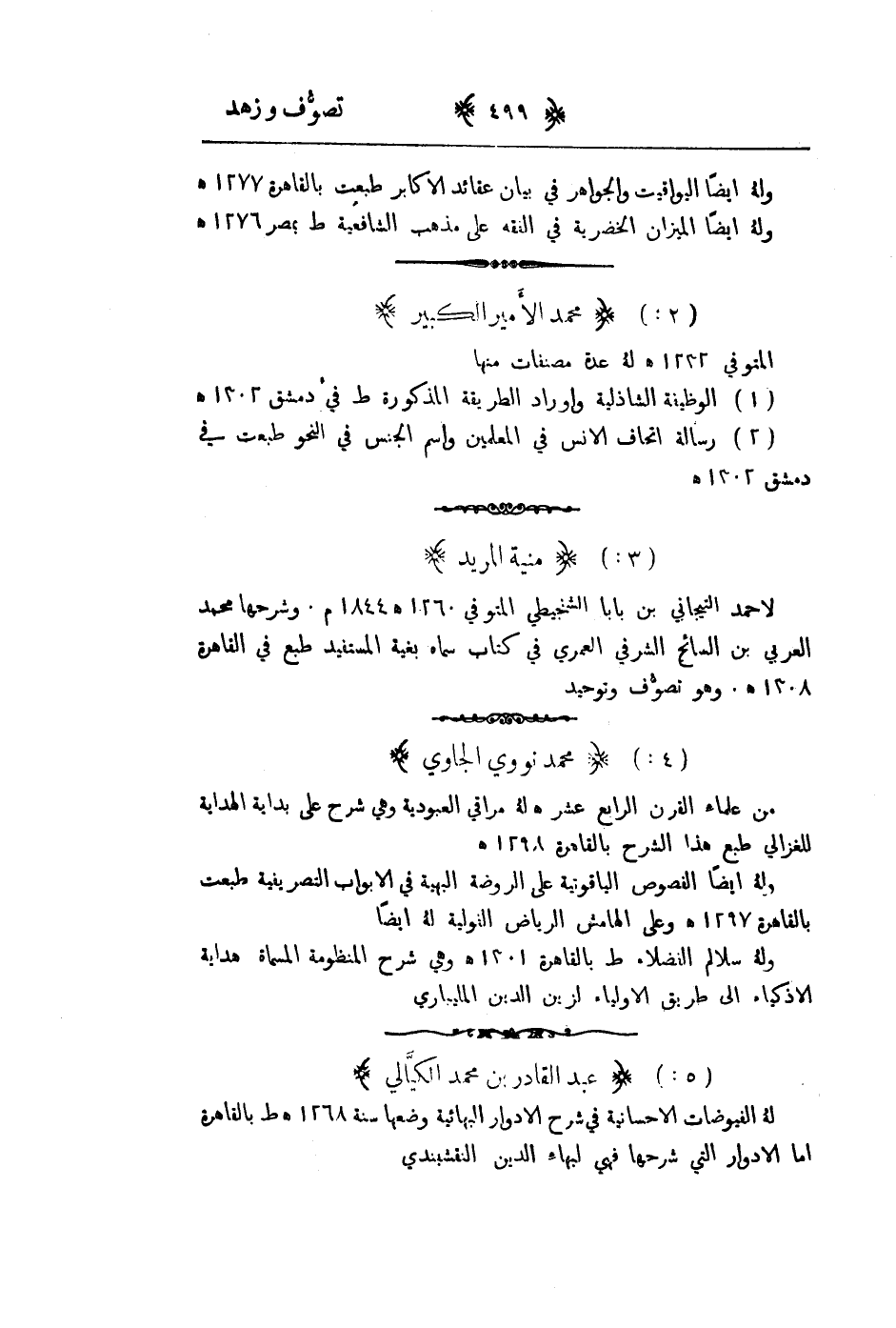 من علماء القرن الرابع عشر للهجرة له مرافي الغبودية وهي شرح على بداية الهداية للغزالي طبع هذا الشرح بالقاهرة 1298هـ وله أيضاً الفصوص الياقوتية على الروضة البهية في الابواب التصريفية طبعت بالقاهرة 1297هـ وعلى الهامش الرياض الفولية له أيضاً وله سلالم الفضلاء طبع بالقاهرة 1301هـ وهي شرح المنظومة المسماة هداية الاذكياء الى طريق الاولياء لزين الدين المليباري