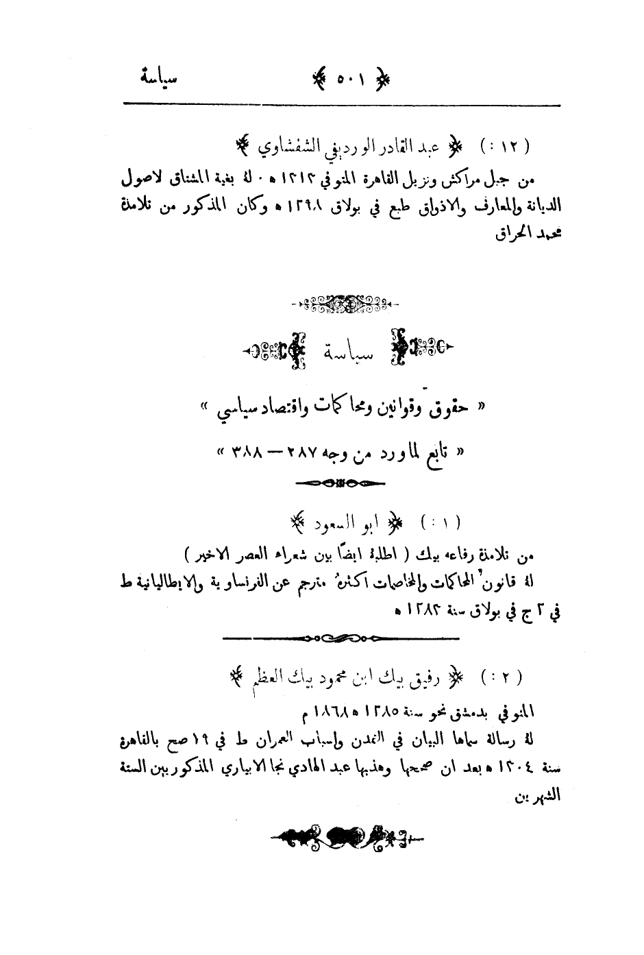 من تلامذة رفاعة بك " اطلبه أيضاً بين شعراء العصر الاخير " له قانون المحاكمات والمخاصمات اكثره مترجم عن الفرنسية والايطالية طبع في 2ج في بولاق سنة 1282هـ