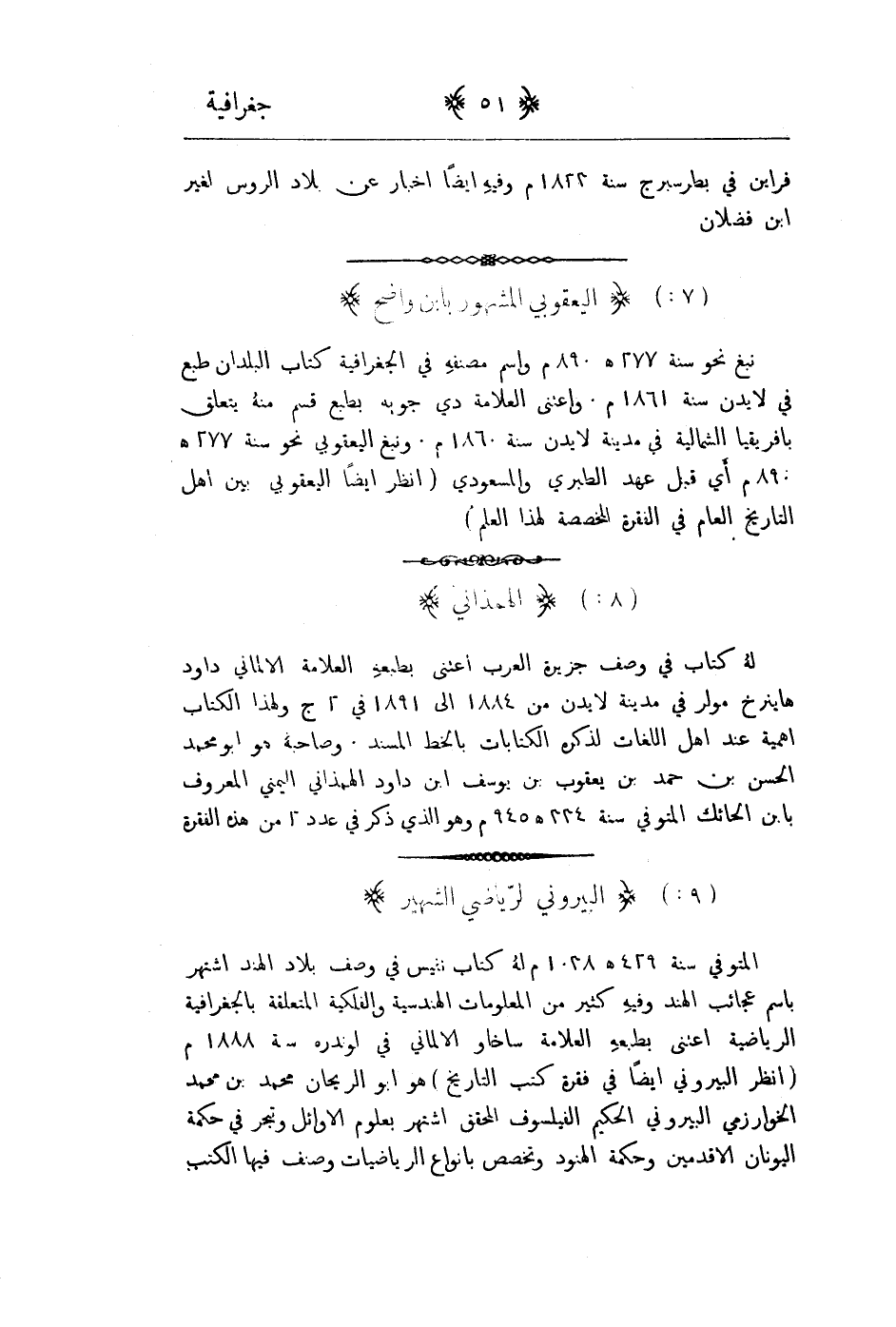 المتوفى سنة 429هـ 1038م له كتاب نفيس في وصف بلاد الهند اشتهر باسم عجائب الهند وغيه كثير من المعلومات الهندسية والفلكية المتعلقة بالجغرافية الرياضية اعتنى بطبعه العلامة ساخاو الالماني قي لوندره سنة 1888م انظر البيروني ايضاً في فقرة كتب التاريخ هو ابو الريحان محمد بن محمد الخوارزمي البيروني الحكيم الفيلسوف المحقق اشتهر بعلوم الاوائل وتبحر في حكمة اليونان الاقدمين وحكمة الهنود وتخصص بانواع الرياضيات وصنف فيها الكتب