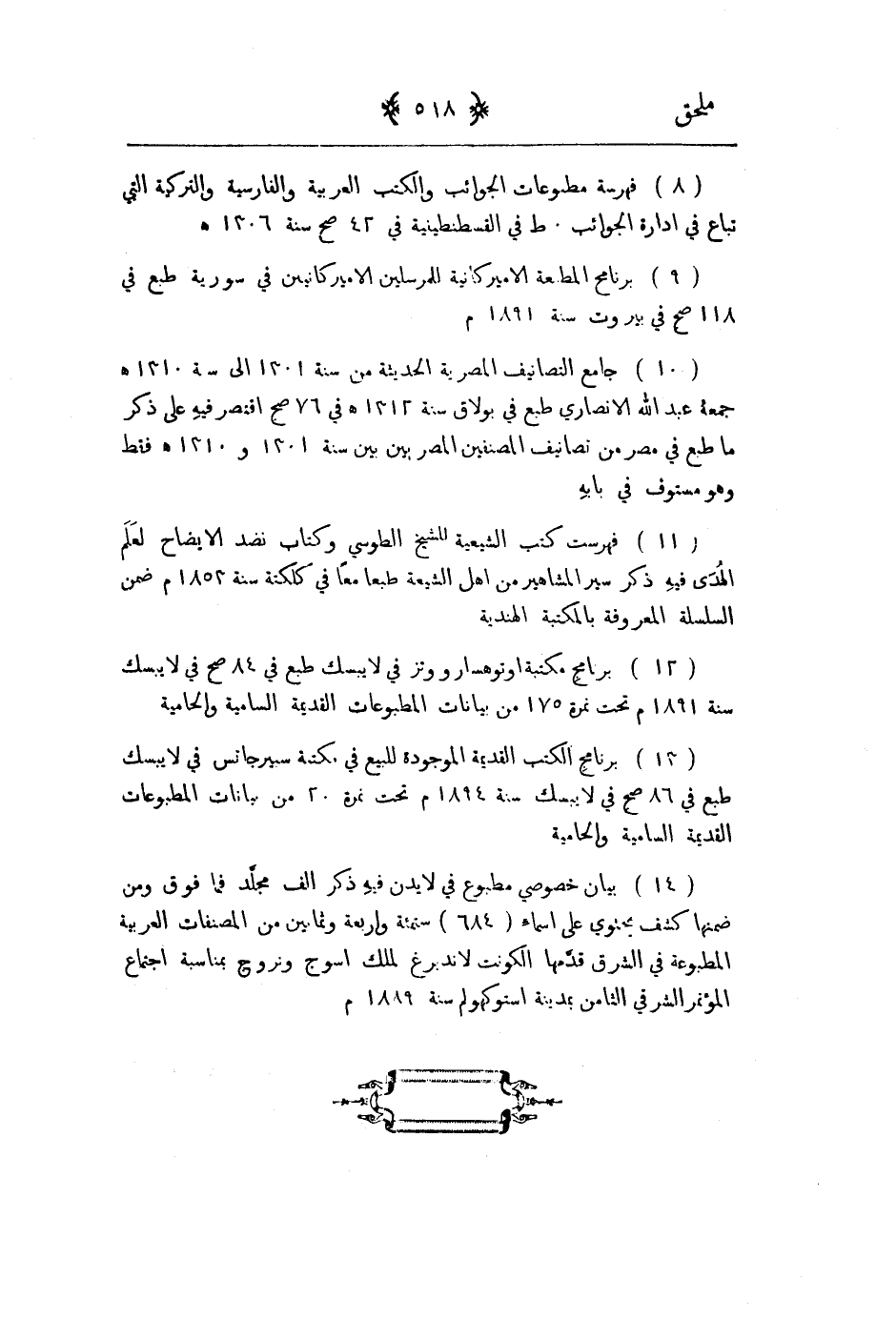 فهرسة مطبوعات الجوائب والكتب العربية والفارسية والتركية التي تباع في ادارة الجوائب طبع في القسطنطينية في 42صح سنة 1306هـ برنامج المطبعة الامريكية للمرسلين الامريكيين في سوريا طبع في 118صح في بيروت سنة 1891م جامع التصانيف المصرية الحديثة من سنة 1301 الى سنة 1310هـ جمعه عبد الله الانصاري طبع في بولاق سنة 1312هـ قي 76صح اقتصر فيه على ذكر ما طبع في مصر من تصانيف المصنفين المصريين بين سنة 1301 و 1310هـ فقط وهو مستوف في بابه فهرست كتب الشيعة للشيخ الطوسي وكتاب نضد الإيضاح لعلم المدى فيه ذكر سير المشاهير من اهل الشيعة طبعا معاً في كلكتا سنة 1853م ضمن السلسلة المعروفة بالمكتبة الهندية برنامج مكتبة اوتوهساروونز في لايبسك طبع في 48صح في لايبسك سنة 1891م تحت ثمرة 175 من بيانات المطبوعات القديمة السامية والحامية برنامج الكتب القديمة الموجودة للبيع في مكتبة سبيرجانس في لايبسك طبع في 86صح في لايبسك سنة 1894م تحت ثمرة 20 من بيانات المطبوعات القديمة السامية الحامية بيان خصوصي مطبوع في لايدن فيه ذكر الف مجلد فما فوق ومن ضمنها كشف يحتوي على اسماء " 684 " ستمائة واربعة وثمانين من المصنفات العربية المطبوعة في الشرق قدمها الكونت لاندبرغ لملك اسوج ونروج بمناسبة اجتماع المؤتمر الشرقي الثامن بمدينة استوكهولم سنة 1889م