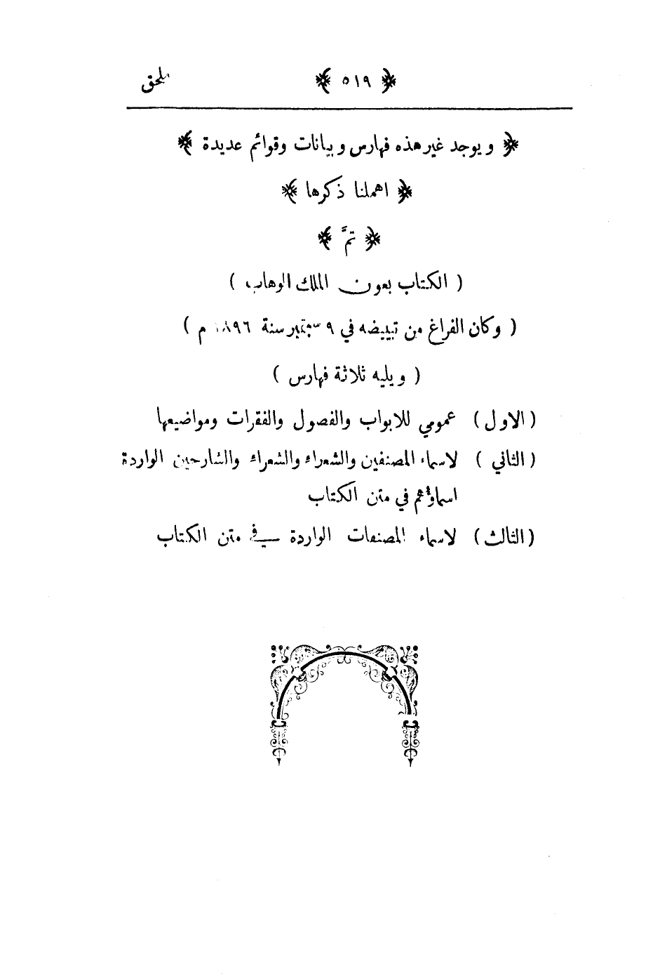 ويوجد غير هذه فهارس وبيانات وقوائم عديدة اهملنا ذكرها تم الكتاب بعون الملك الوهاب وكان الفراغ من تبيضه في 9 سبتمبر سنة 1896م