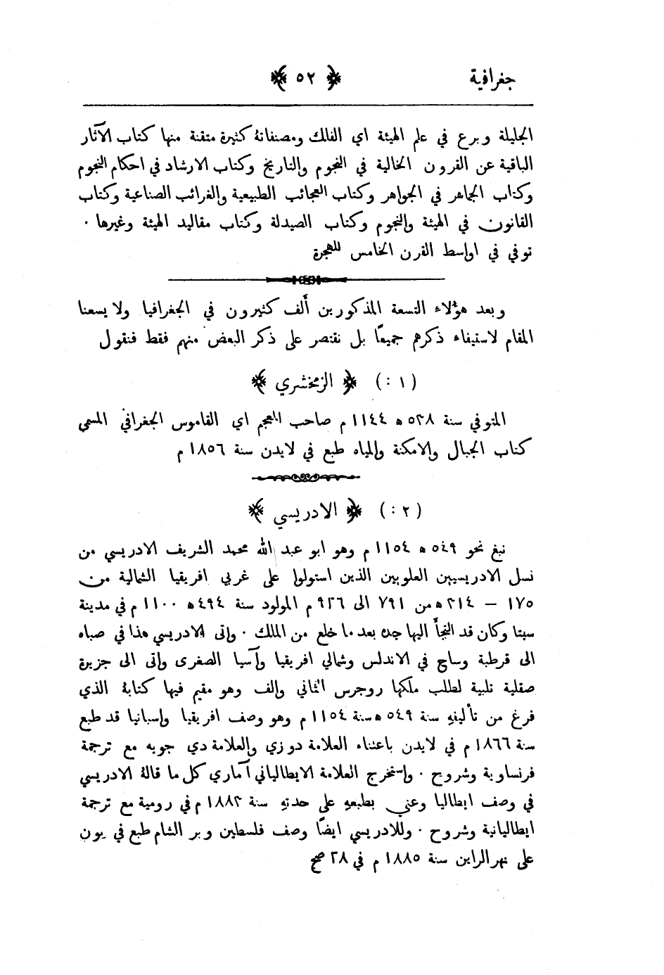 نبغ نحو 549هـ 1154م وهو ابو عبد الله محمد الشريف الادريسي من نسل الادريسيين العلويين الذين استولوا على غربي افريقيا الشمالية من 175 - 314هـ من 791 - 926م المولود سنة 494هـ1100م في مدينة سبتا وكان قد التجأ اليها جده بعد ما خلع الملك. واتى الادريسي هذا في صباه الى قرطبة وساح في الاندلس وشمالي افريقيا وآسيا الصغرى واتى الى جزيرة صقلية تلبة لطلب ملكها روجرس الثاني والف وهو فيها كتابه الذي فرغ من تأليفه سنة 549هـ سنة 1154م وهو وصف افريقيا واسبانيا قد طبع سنة 1866م في لايدن باعتناء العلامة دوزي والعلامة دي جوية مع ترجمة فرنسية وشرح واستخرج العلامة الايطالي آماري كل ما قاله الادريسي في وصف ايطاليا وعني بطبعه على حدته سنة 1883 في روسية مع ترجمة ايطالية وشروح. وللادريسي ايضاً وصف فلسطين وبر الشام طبع في بون على نهر الراين سنة 1885م في 28صح.