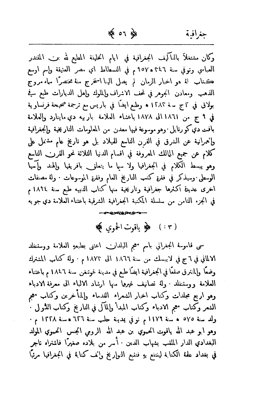 سمي قاموسه الجغرافي باسم معجم البلدان اعتنى بطبعه العلامة ووستنفلد الالماني في 6ج في لايبسك من سنة 1866 الى 1873م وله كتاب المشترك وضعا والمفترق صقعا في الجغرافية ايضاً طبع في مدينة غوتنغن سنة 1846م باعتناء العلامة وستنفلد. وله تصانيف غيرهما منها ارشاد الاباء في معرفة الادباء وهو اربع مجلدات وكتاب اخبار الشعراء القدامى والمتأخرين وكتاب معجم الشعر وكتاب معجم الادباء وكتاب المبدأ والمآل في التاريخ وكتاب الدول. ولد سنة 575هـ 1179م توفي في مدينة حلب سنة 626هـ 1228م. وهو ابو عبد الله ياقوت الحموي بن عبد الله الرومي الجنس الحموي المولود البغدادي الدار الملقب بشهاب الدين. اسر من بلاده صغيرا فاشتراه تاجر في بغداد علمه الكتابة اينتفع به وتتبع التواريخ والف كتابه في الجغرافية مرتبا