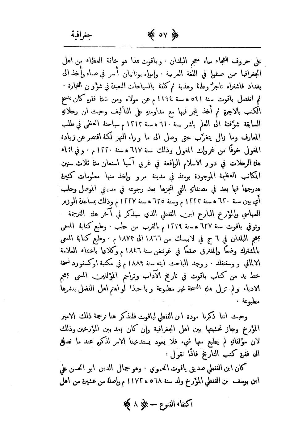 على حروف الهجاء سماه معجم البلدان. وياقوت هذا هو خاتمة العظماء من اهل الجغرافيا ممن صنفوا في اللغة العربية. وابواه يونانيان اسر في صباه واخذ الى بغداد فاشتراه تاجر وعلمه وهذبه ثم كلفه بالسياحات البعيدة في شؤون التجارة. ثم انفصل ياقوت سنة 591هـ 1194م عن مولاه ومن شدة فقره كان ينسخ الكتب بالاجرة ثم اخذ يتجر فيها مع مداومته على التأليف وحيث إن رحلاته السابقة شوقته الى العلم باشر سنة 610هـ 1213م سياحته العظمى في طاب المعارف ومازال يتغرب حتى وصل الى ما وراء النهر لكنه اقتصر عن زيارة المغول خوفا من غزوات المغول وذلك سنة 617هـ 1220م. وفي اثناء هذه الرحلات في دور الاسلام الواقعة في عربي اسيا استعان مدة ثلاث سنين المكاتب العظيمة الموجودة يوم اذ في مدينة مرو واخذ منها معلومات كثيرة هدرجها فيما بعد في مصنفاته التي انجزها بعد رجوعه في مدينتي الموصل وحلب أي بين سنة 620هـ 1223م وسنة 625هـ 1227م وذلك بمساعدة الوزير السياسي والمؤرخ البارع ابن القفطي الذي سيذكر في اخر هذه الترجمة وتوفي ياقوت سنة 627هـ 1229م بالقرب من حاب. وطبع كتابه المسمى معجم البلدان في 6ح في لايبسك من 1866 الى 1873م. وطبع كتابه المسمى المشترك وضعا والمفترق صقعاً في غوتنغن سنة 1846م وكلاهما باعتناء العلامة الاماني ووستنفلد. ووجد الباحث ايثه سنة 1889م في مكتبة اوكسفورد نسخة خط يد من كتاب ياقوت في تاريخ الآداب وتراجم المؤلفين المسمى معجم الادباء ولم تزل هذه النسخة غير مطبوعة ويا حبذا لو اهتم اهل الفضل بنشرها مطبوعة.