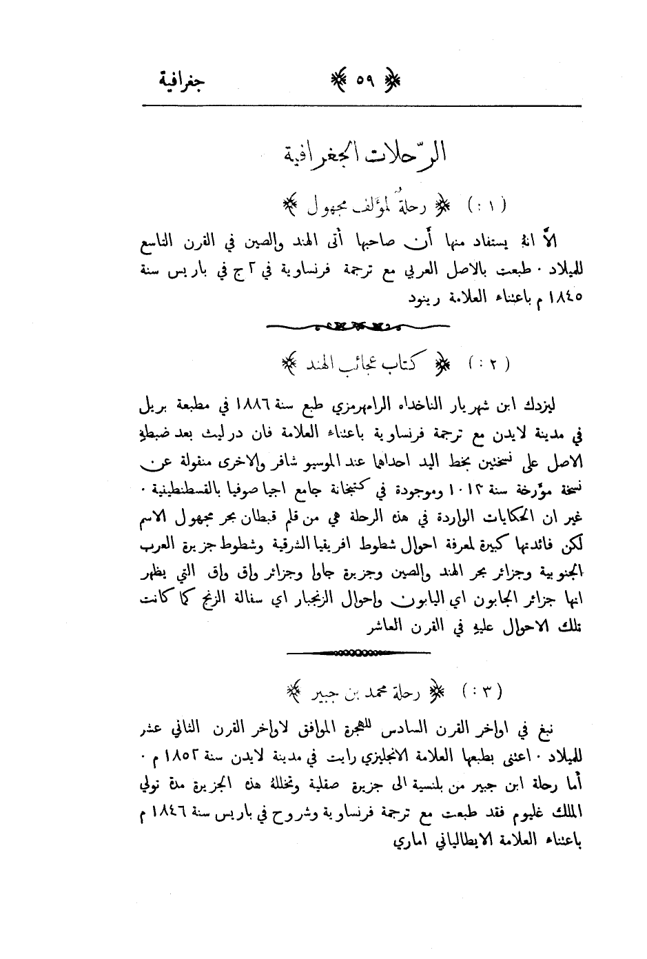 الى انه يستفاد منها إن صاحبها اتى الهند والصين في القرن التاسع للميلاد. طبعت بالاصل العربي مع ترجمة فرنسية في 2ج في باريس سنة 1845م باعتناء العلامة رينود.