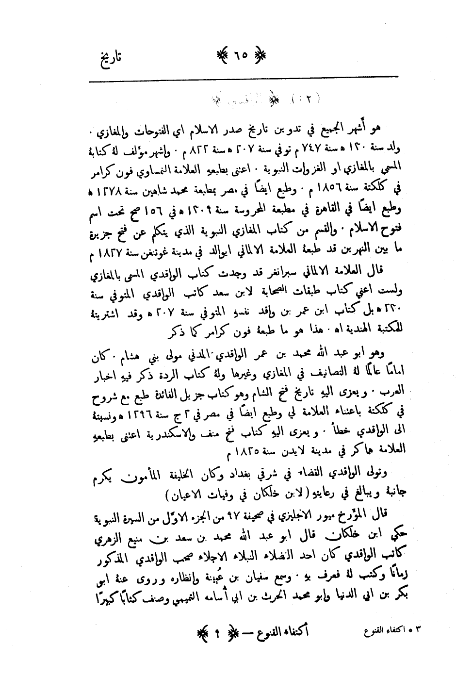 قال العلامة الالماني سيرانغر قد وجدت كتاب الواقدي المسمى بالمغازي ولست اعني كتاب طبقات الصحابة لابن سعد كاتب الواقدي المتوفى سنة 230هـ بل كتاب ابن عمر بن واقد نفسه المتوفى سنة 207هـ وقد اشتريته للمكتبة الهندية. هذا هو ما طبعه فون كرامر كما ذكر.
