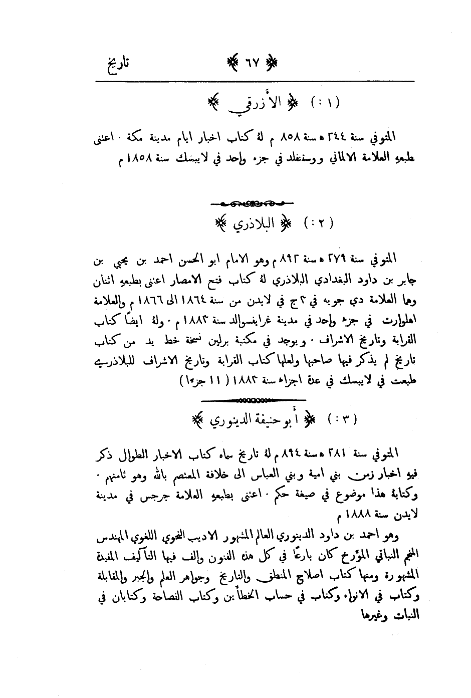 المتوفى سنة 279هـ سنة 892م وهو الامام ابو أحمد بن يحيى بن جابر بن داود البغدادي الاذري له كتاب فتح الامصار اعتنى بطبعه اثنان وهما العلامة دي جوية في 3ج في لايدن من سنة 1864م والعلامة اهلوات في جزء واحد في مدينة غرايفسوالد سنة 1883م وله ايضاً كتاب القرابة والتاريخ الاشراف. ويوجد في مكتبة برلين نسخة خط يد من كتاب تاريخ لم يذكر فيها صاحبها ولعلهما كتاب القرابة وتاريخ الاشراف للبلابري طبعت في لايبسك في عدة اجزاء سنة 1883م 11ج.