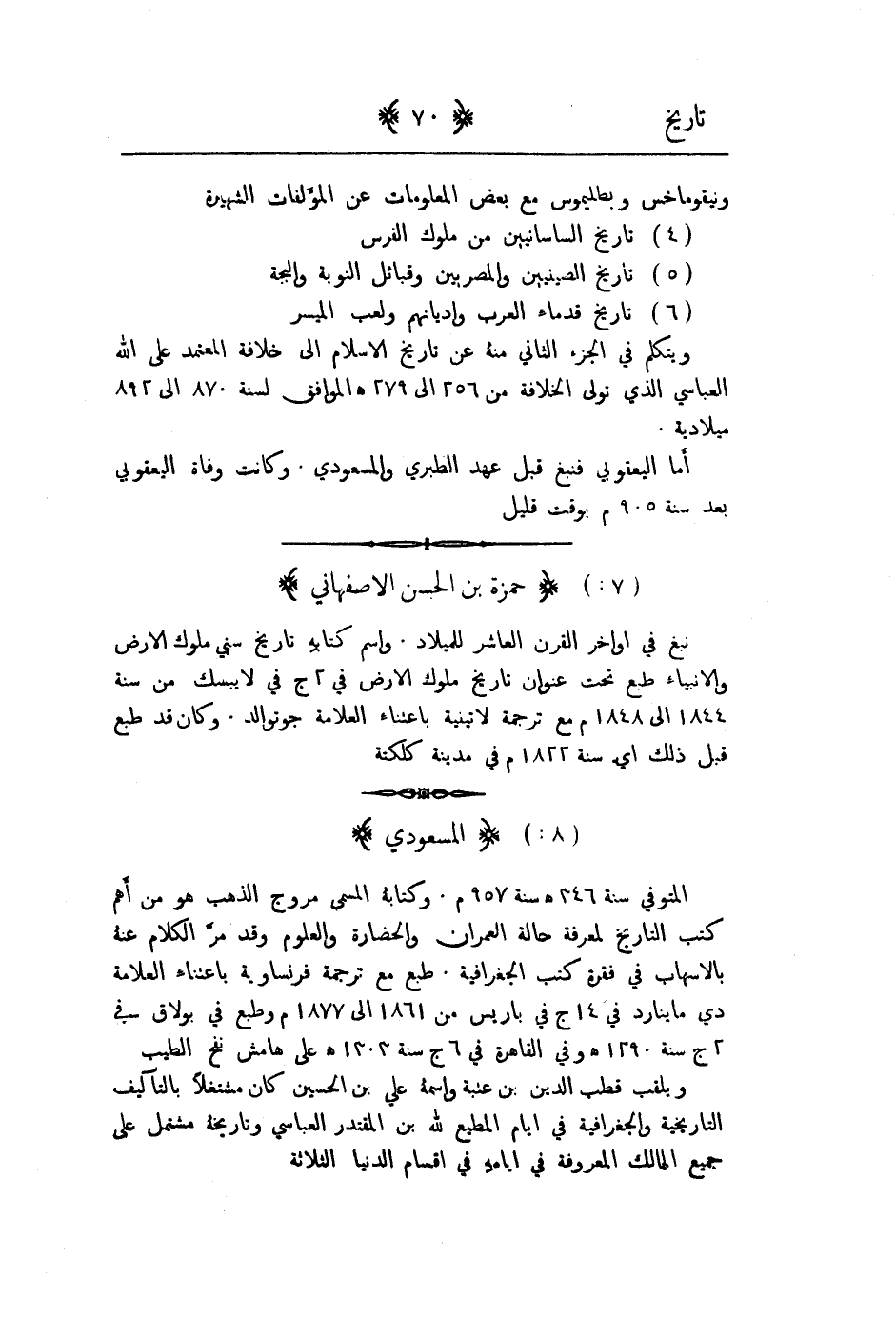 المتوفى سنة 346هـ 957م. وكتابه المسمى مروج الذهب هو من اهم كتب التاريخ لمعرفة حالة العمران والحضارة والعلوم وقد مر الكلام عنه بالاسهاب في فقرة كتب الجغرافية. طبع مع ترجمة فرنسية باعتناء العلامة دي ماينارد في 14ج في باريس من 1861 الى 1877م وطبع في بولاق في 2ج سنة 1290هـ وفي القاهرة في 6ج سنة 1303هـ على هامش نفح الطيب.