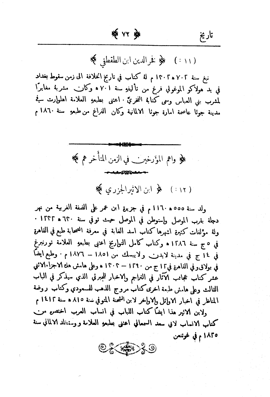 ولد سنة 555هـ 1160م في جزيرة ابن عمر على الضفة الغربية من نهر دجلة بقرب الموصل واستوطن في الموصل حيث توفي سنة 630هـ 1232م. وله مؤلفات كثيرة اشهرها كتاب اسد الغلبة في معرفة الصحابة طبع في القاهرة في 5ج سنة 1286هـ وكتاب كامل التواريخ اعتنى بطبعه العلامة تورنبرغ في14 ج في مدينة لايدن ولايبسك من 1851 - 1876م. وطبع ايضاً في بولاق وفي القاهرة في 12ج من 1290 - 1303هـ وعلى هامش هذه الاجزاء الأثني عشر كتاب عجائب الاثار في التراجم والاخبار للجبرتي الذي سيذكر في الباب الثالث وعلى هامش طبعة اخرى كتاب مروج الذهب للمسعودي وكتاب روضة المناظر في اخبار الاوائل والاواخر لابن شحنة المتوفى سنة 815هـ 1412م.