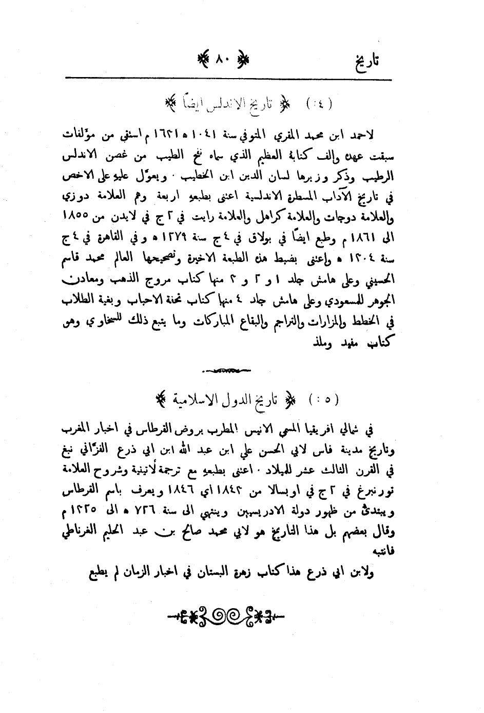 لأحمد ابن محمد المقري المتوفى سنة 1041هـ 1631م استقى من مؤلفات سبقت عهده والف كتابه العظيم الذي سماه نفح الطيب من غصن الاندلس الرطيب وذكر وزيرها لسان الدين ابن الخطيب ويعول عليه على الاخص في تاريخ الآداب المسطرة الاندلسية اعتنى بطبعه اربعة وهم العلامة دورزي والعلامة دوجات والعلامة كراهل والعلامة رايت في 2ج في لايدن من 1855 الى 1861م وطبع ايضاً في بولاق في 4ج في سنة 1279هـ وفي القاهرة في 4ج سنة 1304هـ واعتنى بضبط هذه الطبعة الاخيرة وتصحيحها العالم محمد قاسم الحسيني وعلى هامش جلد 1 و 2و 3 منها كتاب مروج الذهب ومعادن الجوهر للمسعودي وعلى هامش جلد 4 منها كتاب تحفة الاحباب وبغية الطلاب في الخطط والمزارات والتراجم والبقاع المباركات وما يتبع ذلك للسخاوي هو كتاب مفيد وملذ.