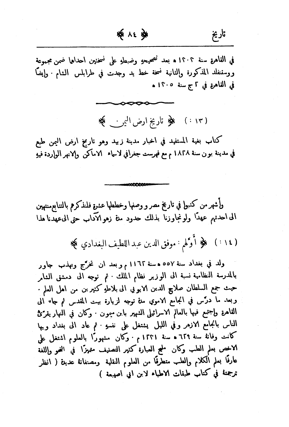 كتاب بغية المستفيد في اخبار مدينة زبيد وهو تاريخ ارض اليمن طبع في مدينة بون سنة 1828م مع فهرست جغرافي لاسماء الانهار الواردة فيه واشهر من كتبوا في تاريخ مصر ووصفها وخططها عشرة فلنذكرهم بالتتابع منتهين الى احدثهم عهدا ولو تجاوزنا بذلك حدود مدة زهو الآداب حتى الى عهدنا هذا