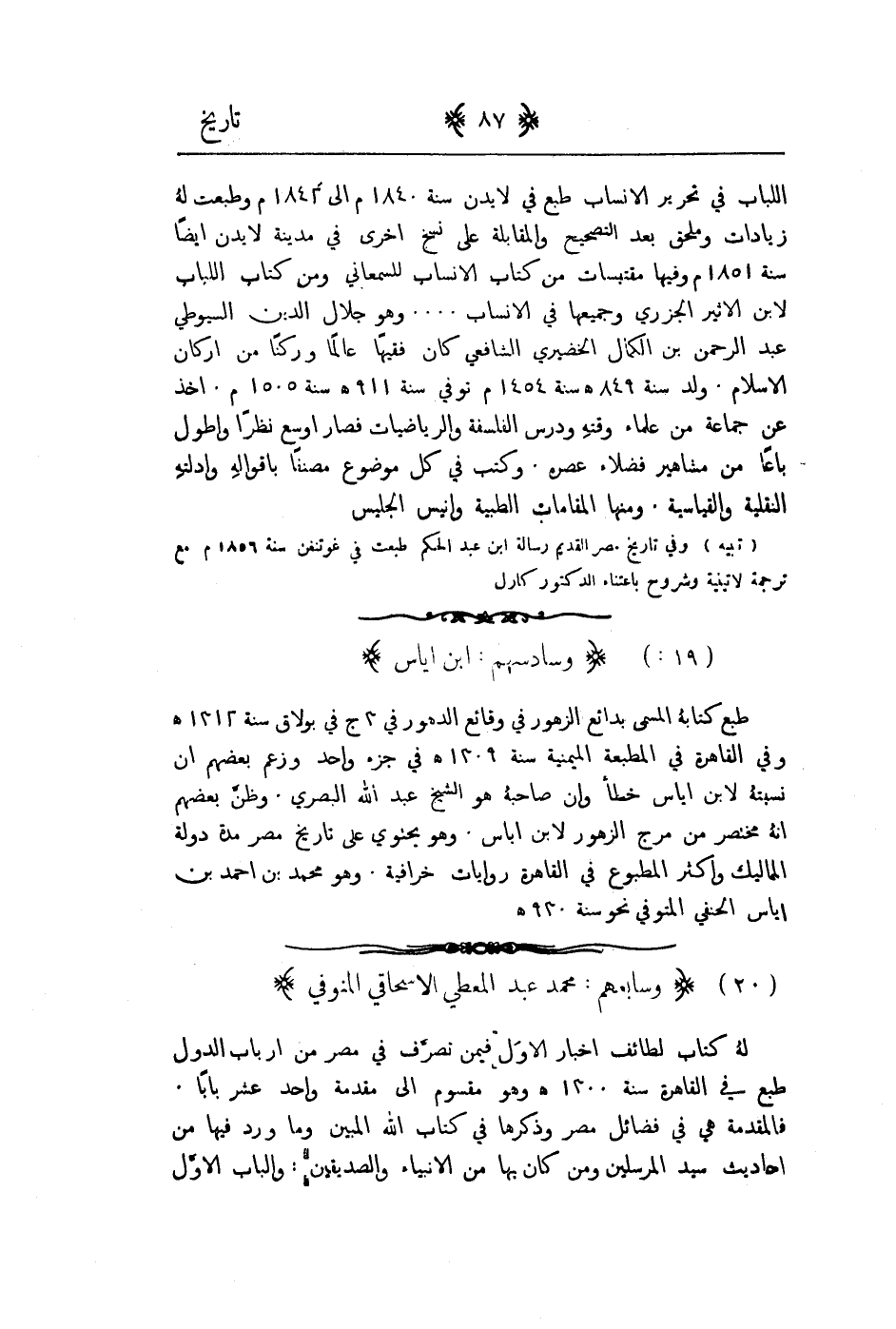 اللباب في تحرير الانساب طبع في لايدن سنة 1840م الى 1842م وطبعت له زيادات وملحق بعد التصحيح والمقابلة على نسخ اخرى في مدينة لايدن ايضاً سنة 1851م وفيها مقتبسات من كتاب الانساب للسمعاني ومن كتاب اللباب لابن الاثير الجزري وجمعها في الانساب.... وهو جلال الدين السيوطي عبد الرحمن بن كمال الخضري الشافعي كان فقيها عالماً وركنا من اركان الاسلام. ولد سنة 849هـ سنة 1454م توفى سنة 911هـ سنة 1505م. اخذ عن جماعة من علماء وقته ودرس الفلسفة والرياضيات فصار اوسع نظراً واطول باعاً من مشاهير فضلاء عصره. وكتب في كل موضوع مصنفاً باقواله وادلته النقلية والقياسية. ومنها المقامات الطبية وانيس الجليس تنبيه وفي تاريخ مصر القديم رسالة ابن عبد الحكيم طبعت في غوتنغن سنة 1856م مع ترجمة لاتينية وشروح باعتناء الدكتور كارل