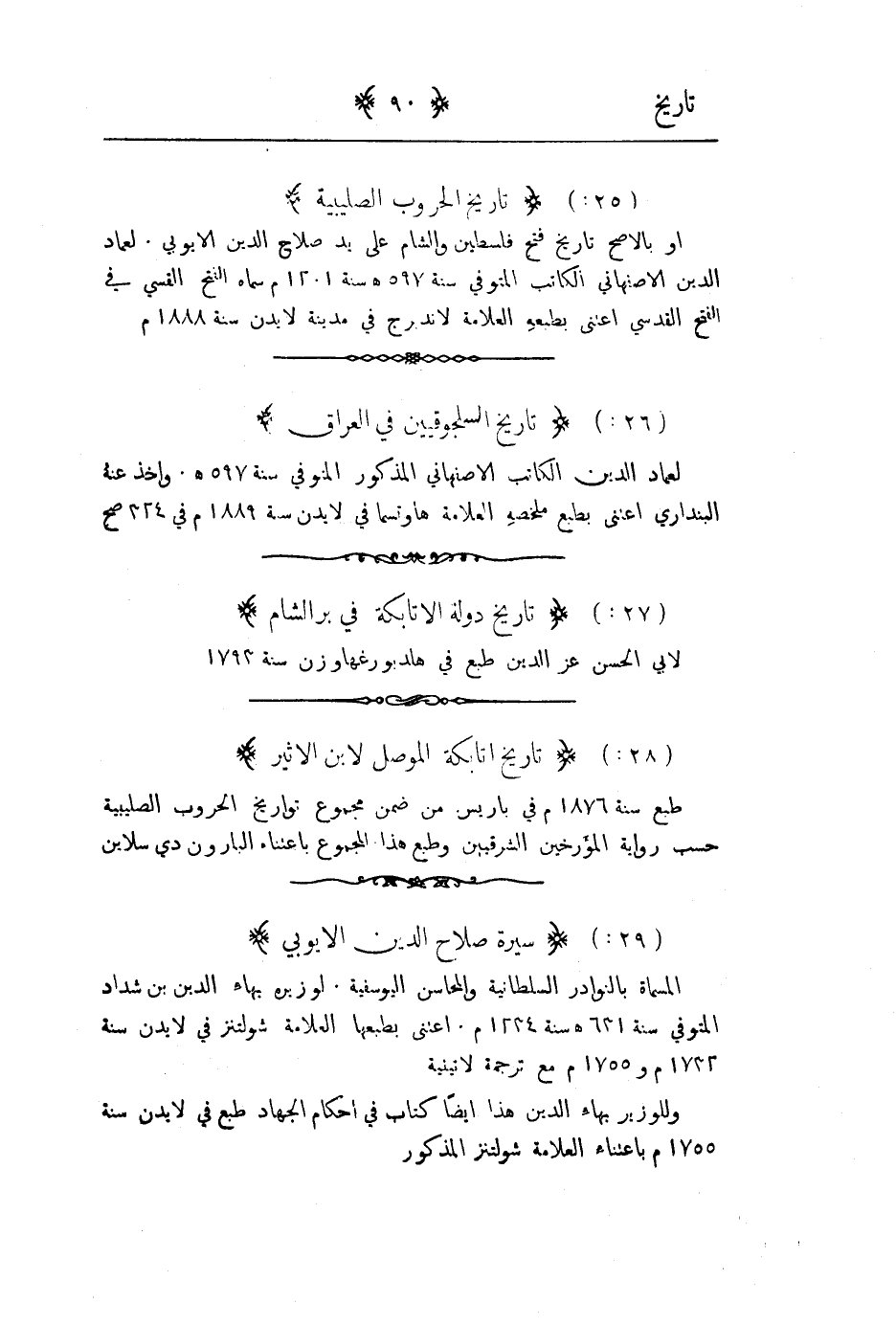 المسماة بالنوادر السلطانية والمحاسن اليوسفية لوزيره بهاء الدين بن شداد المتوفى سنة 631هـ سنة 1334م اعتنى بطبعها العلامة شولتنز في لايدن سنة 1732م و 1755م مع ترجمة لاتينية وللوزير بهاء الدين هذا ايضاً كتاب في احكام الجهاد طبع في لايدن سنة 1755م باعتناء العلامة شولتنز المذكور