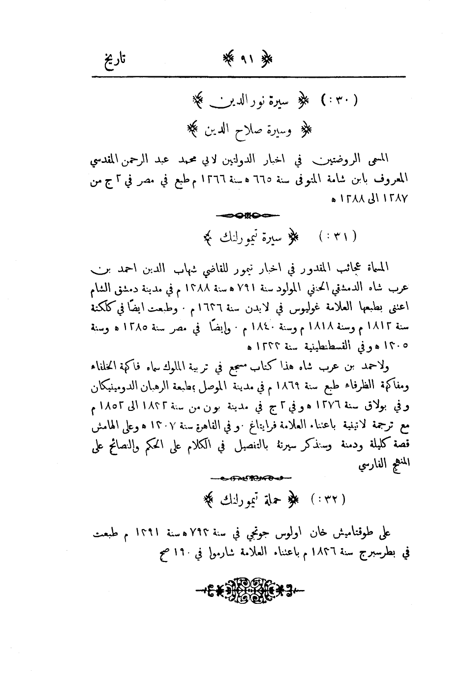 المسماة عجائب المقدور في اخبار تيمور للقاضي شهاب الدين أحمد بن عرب شاه الدمشقي الحنفي المولود سنة 791هـ 1388م في مدينة دمشق الشام اعتنى بطبعها العلامة غوليوس في لايدن سنة 1636م. وطبعت ايضاً في كلكته سنة 1305 هـ وفي القسطنطينية سنة 1233هـ ولأحمد بن عرب شاه هذا كتاب مسجع في تربية الملوك سماه فاكهة الخلفاء ومفاكهة الظرفاء طبع سنة 1869 م في مدينة الموصل بمطبعة الرهبان الدرمينيكان وفي بولاق سنة 1276هـ وفي 2ج في مدينة بون من سنة 1833 الى 1852م مع ترجمة لاتينية باعتناء العلامة فرايتاغ وفي القاهرة سنة 1307هـ وعلى الهامش قصة كليلة ودمنة وسنذكر سيرته بالتفصيل في الكلام على الحكم والنصائح على المنهج الفارسي