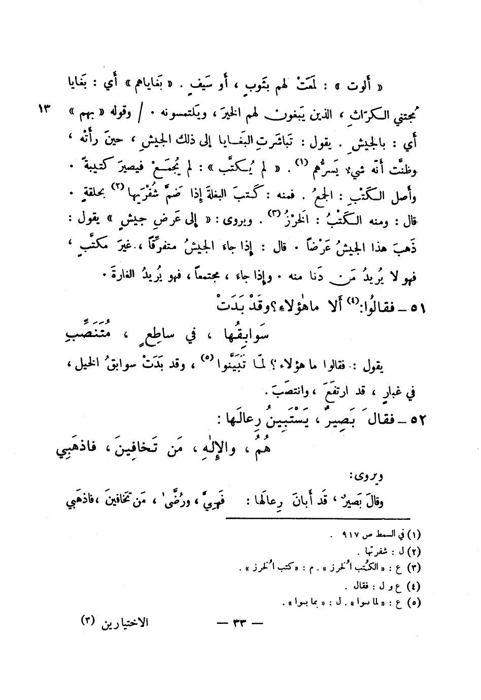 ألوت": لمعت لهم بثوبٍ، أو سيفٍ. "بغاياهم": أي: بغايا مجتني الكراث، الذين يبغون لهم الخير، ويلتمسونه وقوله: "بهم" أي: بالجيش. يقول: تباشرت البغايا إلى ذلك الجيش، حين رأته، وظنت أنه شيء يسرهم. "لم يكتب": لم يجمع فيصير كتيبةً. وأصل الكتب: الجمع. فمنه: كتب البغلة إذا ضم شفريها بحلقةٍ. قال: ومنه الكتب: الخرز. ويروى: "إلى عرض جيشٍ" يقول: ذهب هذا الجيش عرضاً. قال: إذا جاء الجيش متفرقاً، غير مكتبٍ، فهو لا يريد من دنا منه. وإذا جاء، مجتمعاً، فهو يريد الغارة.