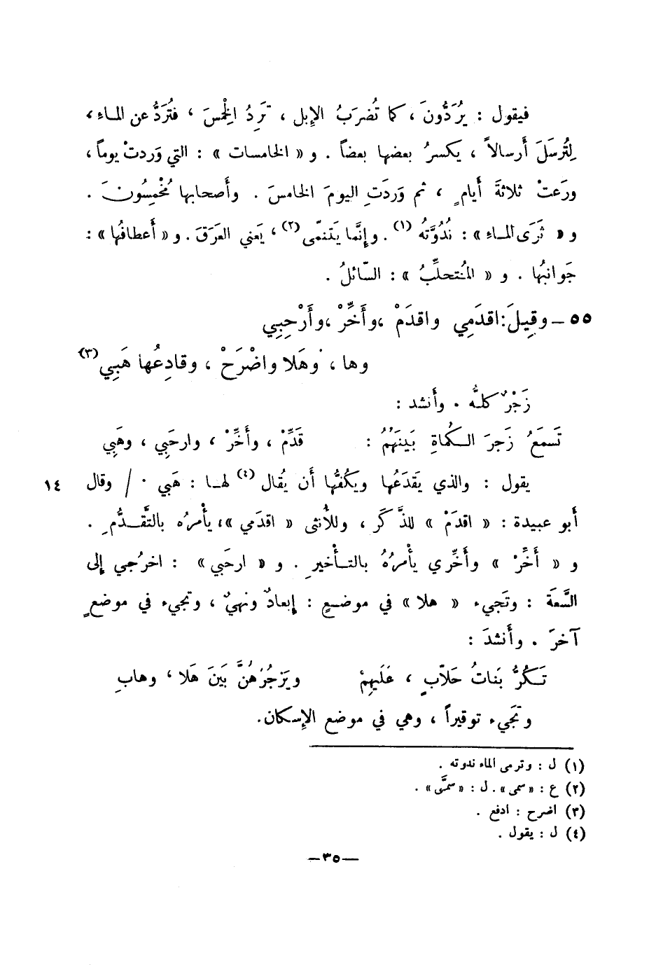 فيقول: يردون، كما تضرب الإبل، ترد الخمس، فترد عن الماء، لترسل أرسالاً، يكسر بعضها بعضاً. و"الخامسات": التي وردت يوماً، ورعت ثلاثة أيامٍ، ثم وردت اليوم الخامس. وأصحابها مخمسون. و"ثرى الماء": ندوته. وإنما يتنمى، يعني العرق. و"أعطافها": جوانبها. و"المنتحلب": السائل.
