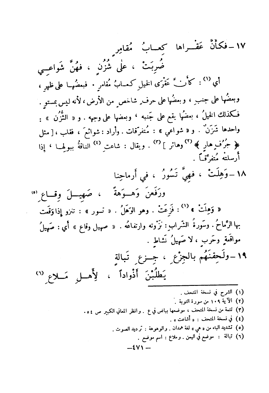 أي: كأن عقرى الخيل كعاب مقامرٍ، فبعضها على ظهر، وبعضها على جنبٍ، وبعضها على حرف شاخصٍ من الأرض، لأنه ليس بمستوٍ. فكذلك الخيل، بعضها يقع على جنبه، وبعضها على وجهه. و"الشزن": واحدها شَزَنٌ. و"شواعي": متفرقات. وأراد: شوائع، فقلب، [مثل (جرف هارٍ) وهائر] . ويقال: شاعت الناقة ببولها، إذا أرسلته متفرقاً.