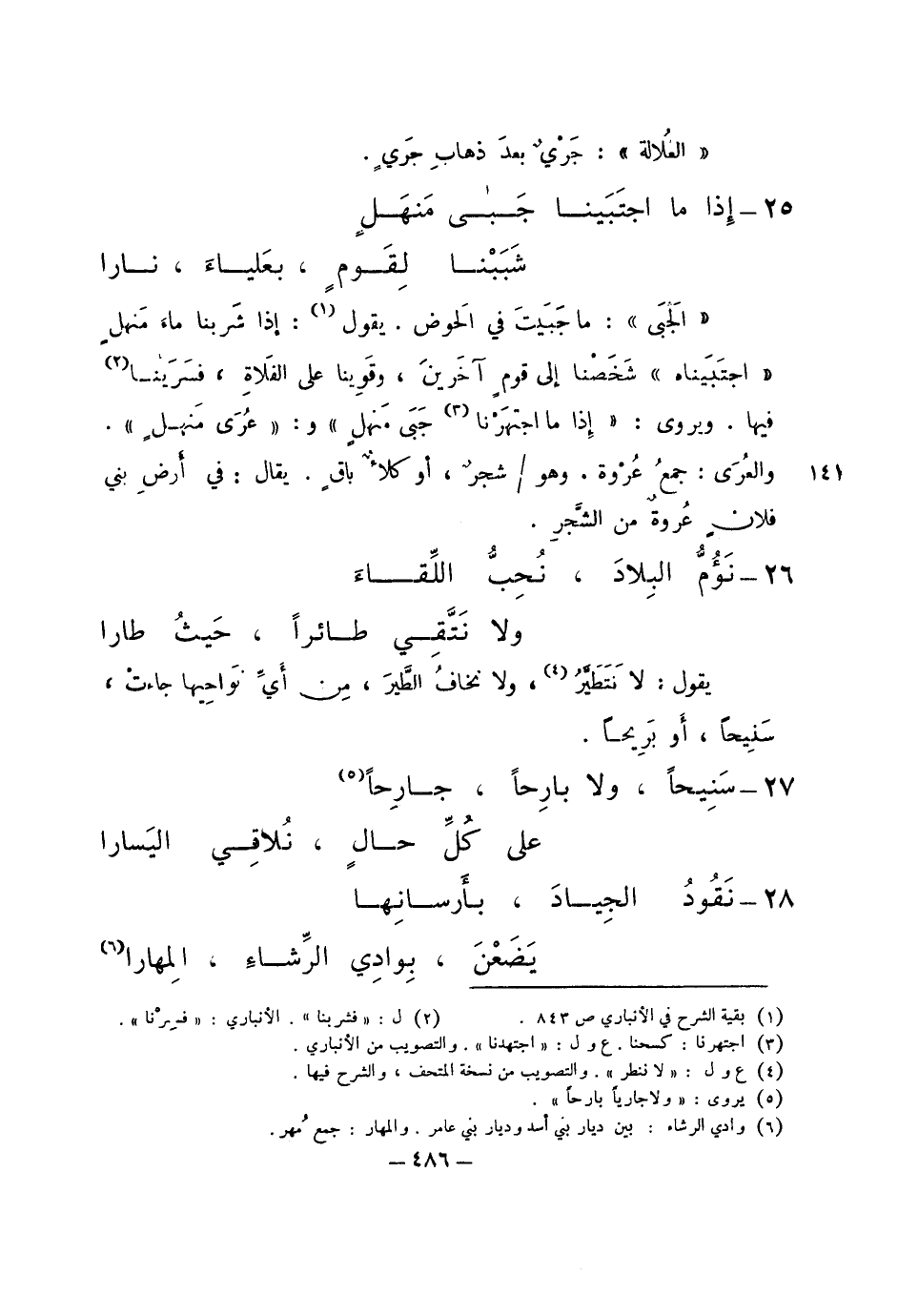 "الجبى": ما جبيت في الحوض. يقول: إذا شربنا ماء منهلٍ "اجتبيناه": شخصنا إلى قومٍ آخرين، وقوينا على الفلاة، فسرينا فيها. ويروى: "إذا ما اجتهرنا جبى منهلٍ" و:"عرى منهل". والعرى: جمع عروة. وهو شجر، أو كلأ باقٍ. يقال: في أرض بني فلان عروةٌ من الشجر.