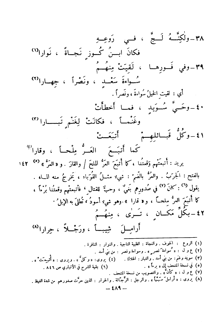يريد: أتبعتهم وقعتنا، كما أتبع العر الملح والقار. و"العر" بالفتح: الجرب. والعر بالضم: شيء مثل القوباء، يخرج منه الماء. يقول: كان في صدورهم بغي، وحب للقتال، فأتبعتهم وقعتنا برءاً، كما أتبع العر ملحاً، و"قارا": وهو شيء أسود، تطلى به الإبل.