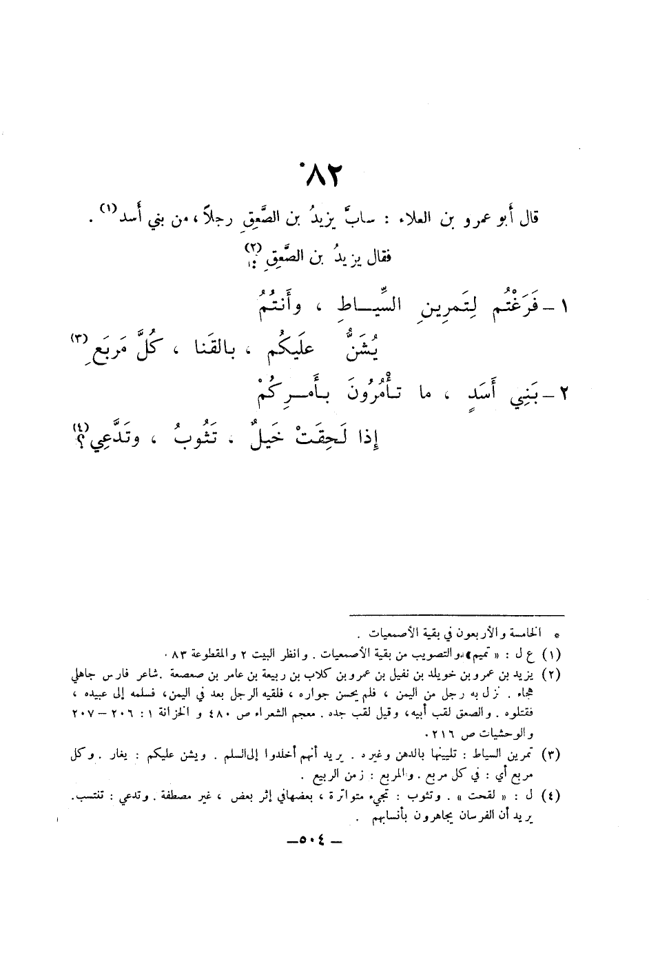 82 وقال أبو عمرو بن العلاء ساب يزيد بن الصعق رجلاً، من بني أسد. فقال يزيد بن الصعق