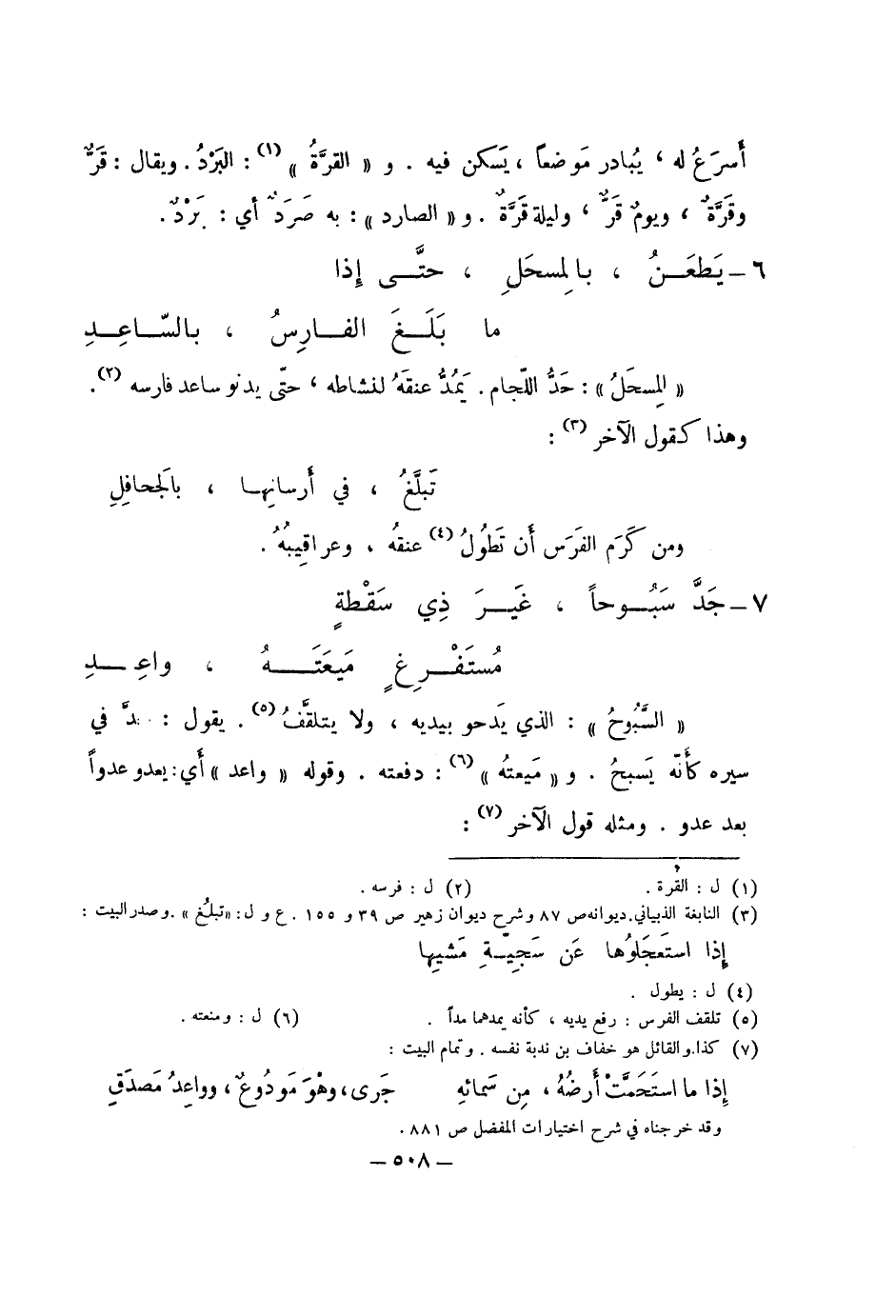"المسحل": حد اللجام. يمد عنقه لنشاطه، حتى يدنو ساعد فارسه. وهذا كقول الآخر: