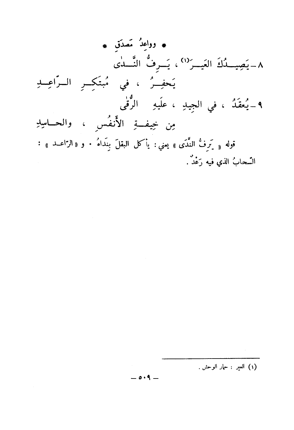قوله: "يرف الندى" يعني: يأكل البقل بنداه. و"الراعد": السحاب الذي فيه رعد.