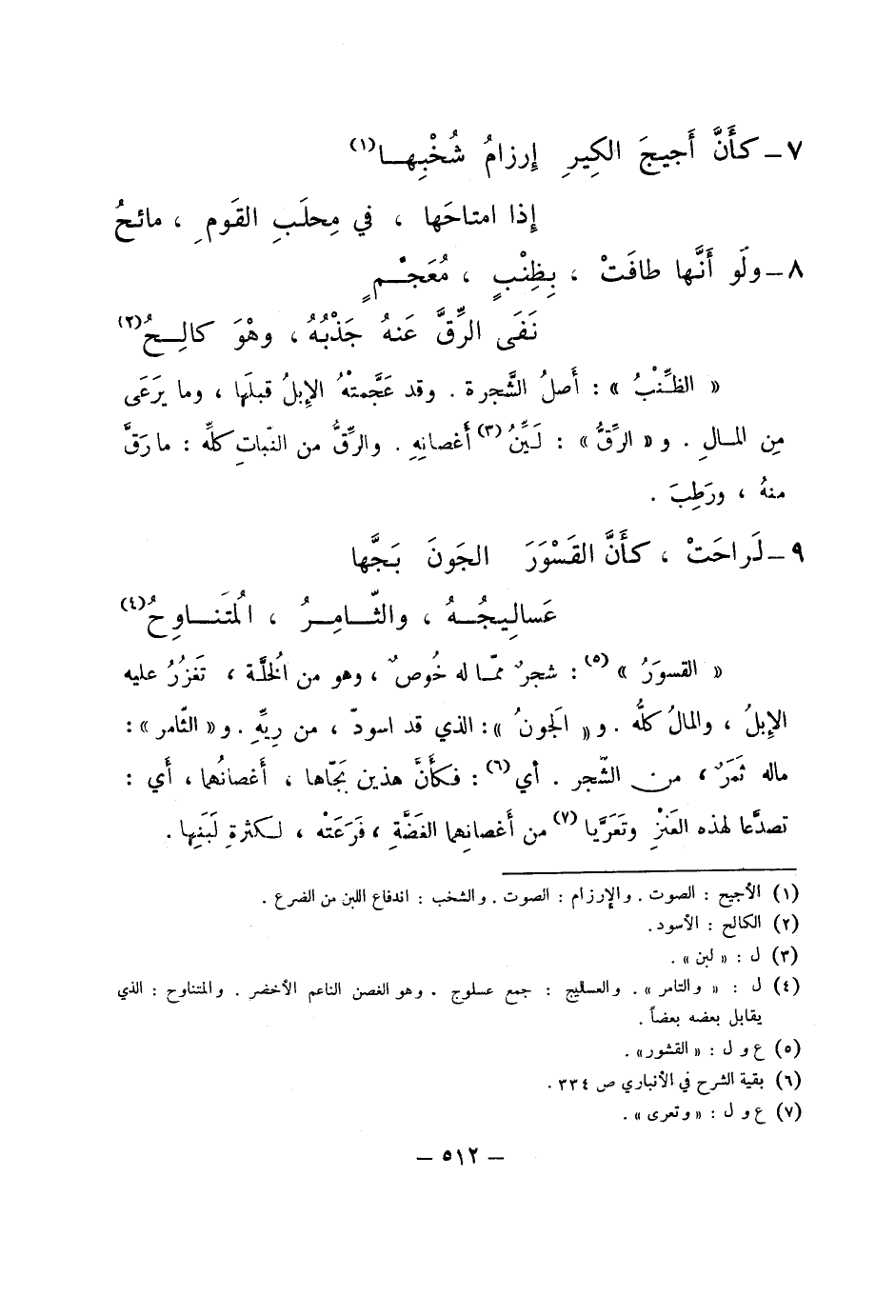 "القسور": شجر مما له خوص، ووهو من الخلة، تغزر عليه الإبل، والمال كله. و"الجون": الذي قد اسود، من ريه. و"الثامر": ماله ثمر، من الشجر. أي: فكأن هذين بجاها، أغصانهما، أي: تصدعا لهذه العنز وتعريا من أغصانهما الغضة، فرعته، لكثرة لبنها.