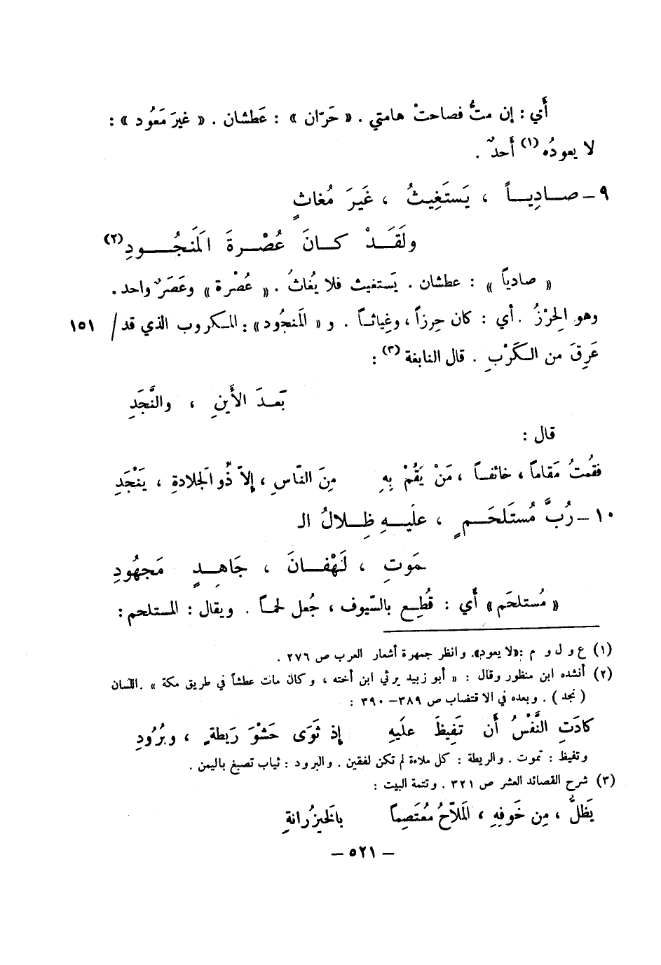 "صادياً": عطشان. يستغيث فلا يغاث. "عصرة" وعصرٌ واحد. وهو الحرز, أي: كان حرزاً، وغياثاً. و"المنجود": المكروب الذي قد عرق من الكرب. قال النابغة: