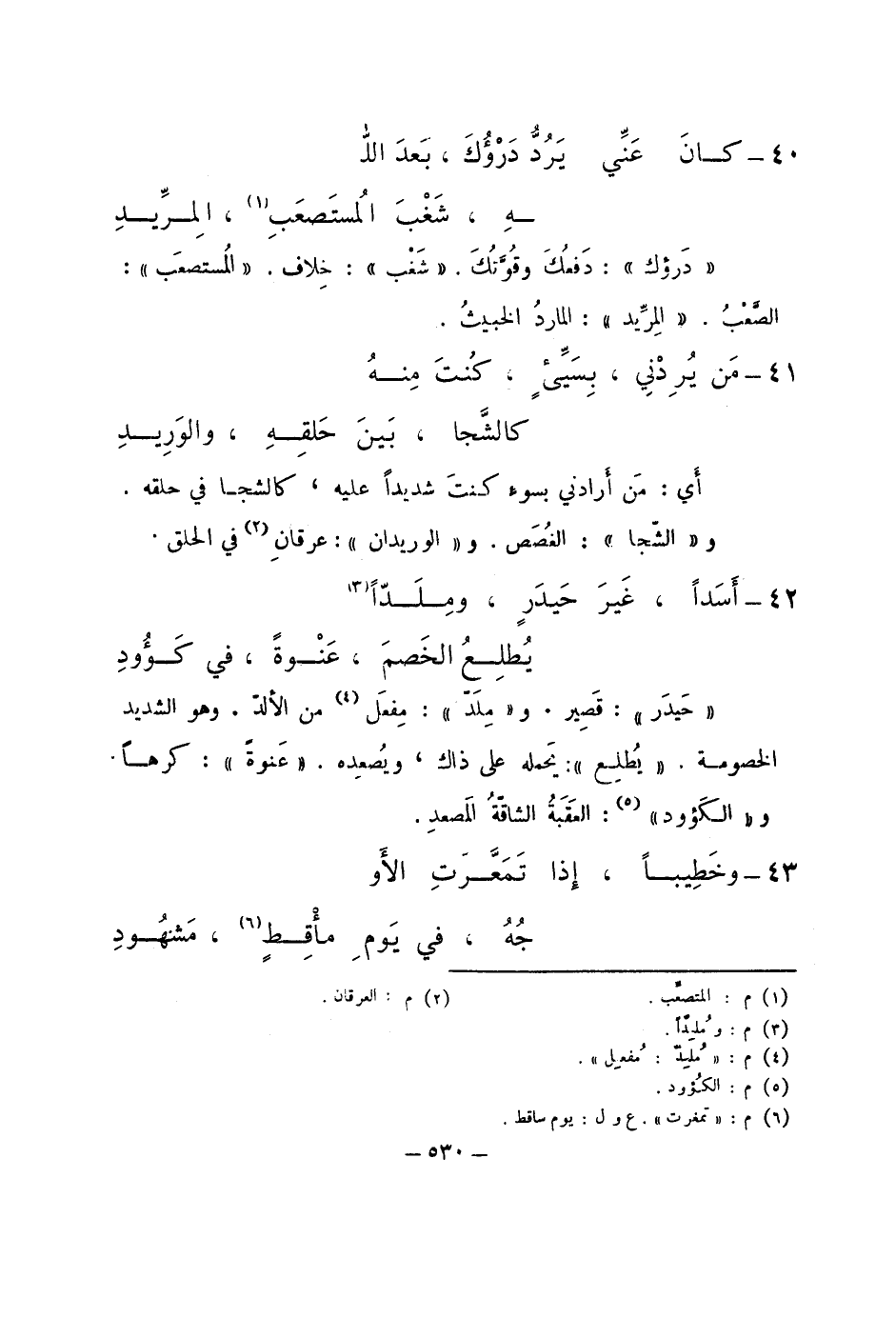 "حيدر": قصير. و"ملد": مفعل من الألد. وهو الشديد الخصومة. "يطلع": يحمله على ذاك، ويصعده. "عنوة": كرهاً. و"الكؤود": العقبة الشاقة المصعد.