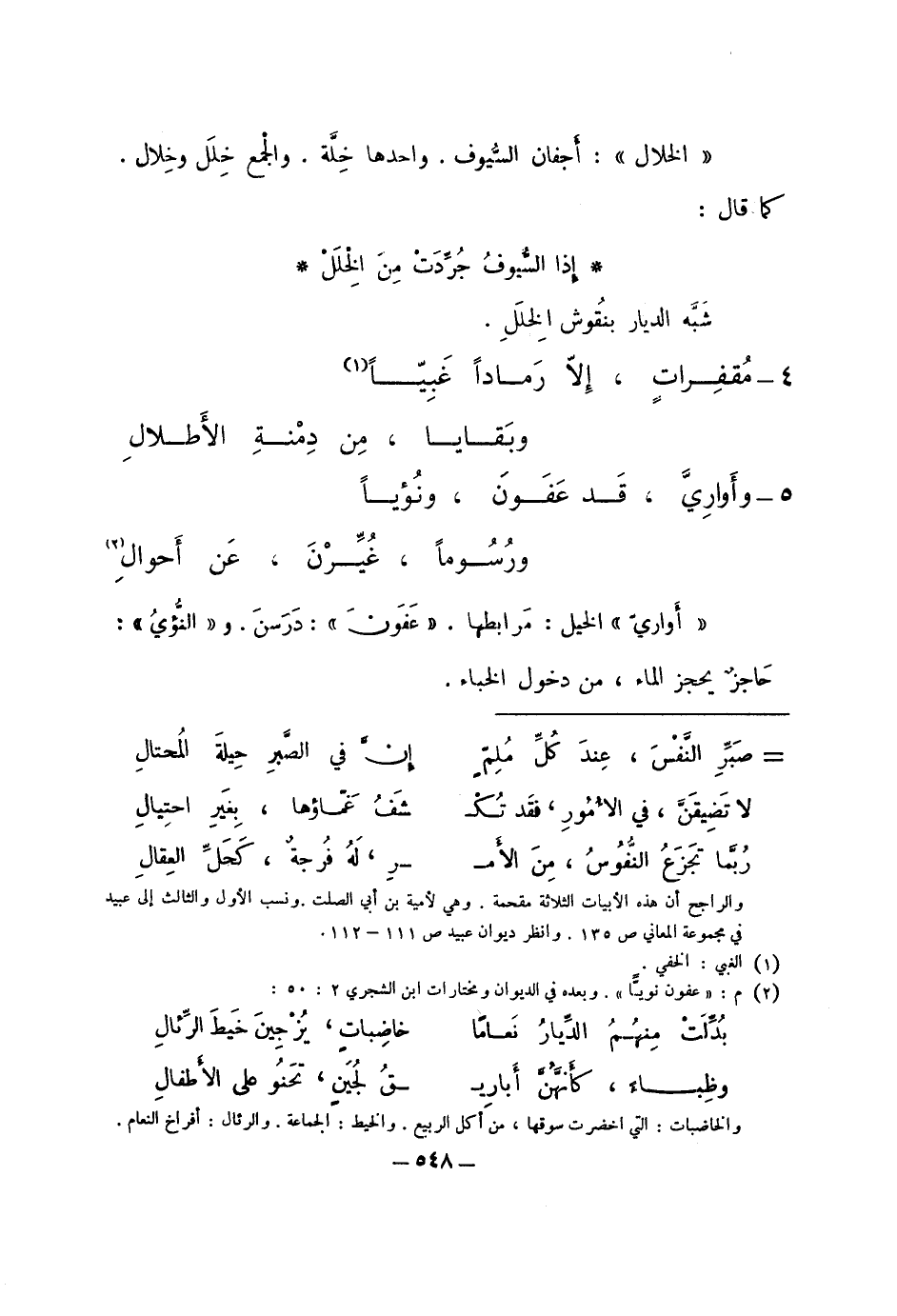"أواري" الخيل: مرابطها. "عفون": درسن. و"النؤي": حاجز يحجز الماء، من دخول الخباء.