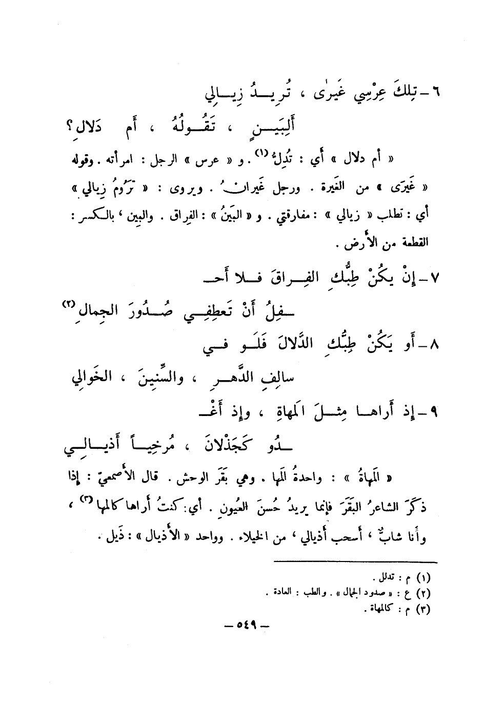 "أن دلال" أي: تدل. و"عرس" الرجل: امرأته. وقوله "غيرى" من الغيرة. ورجل غيران. ويروى: "تروم زيالي" أي: تطلب "زيالي": مفارقتي. و"البين": الفراق. والبين بالكسر: القطعة من الأرض.