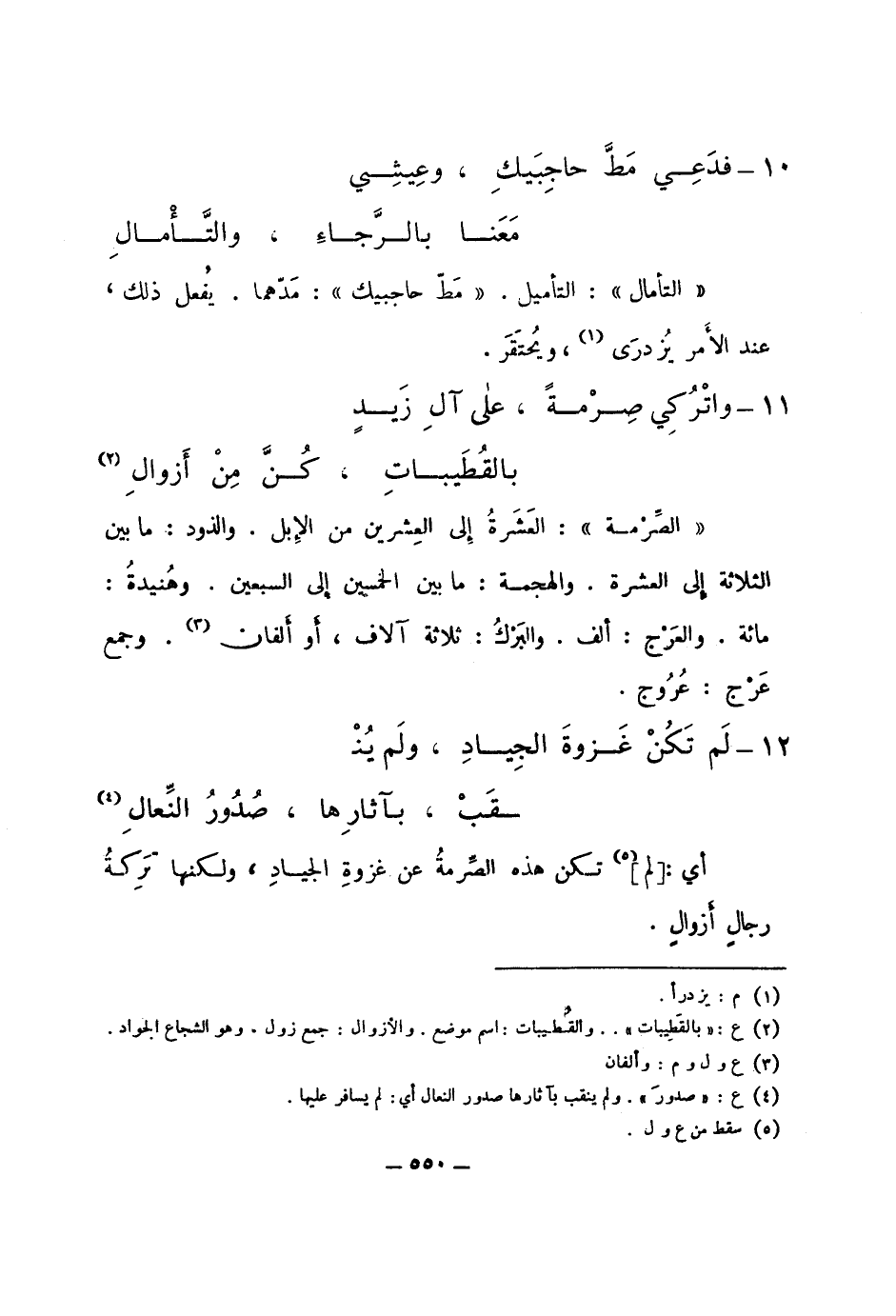"الصرمة": العشرة إلى العشرين من الإبل. والذود: ما بين الثلاثة إلى العشرة, والهجمة: ما بين الخمسين إلى السبعين. وهنيدة: مائة. والعرج: ألف. والبرك: ثلاثة آلاف، أو ألفان. وجمع عرج: عروج.