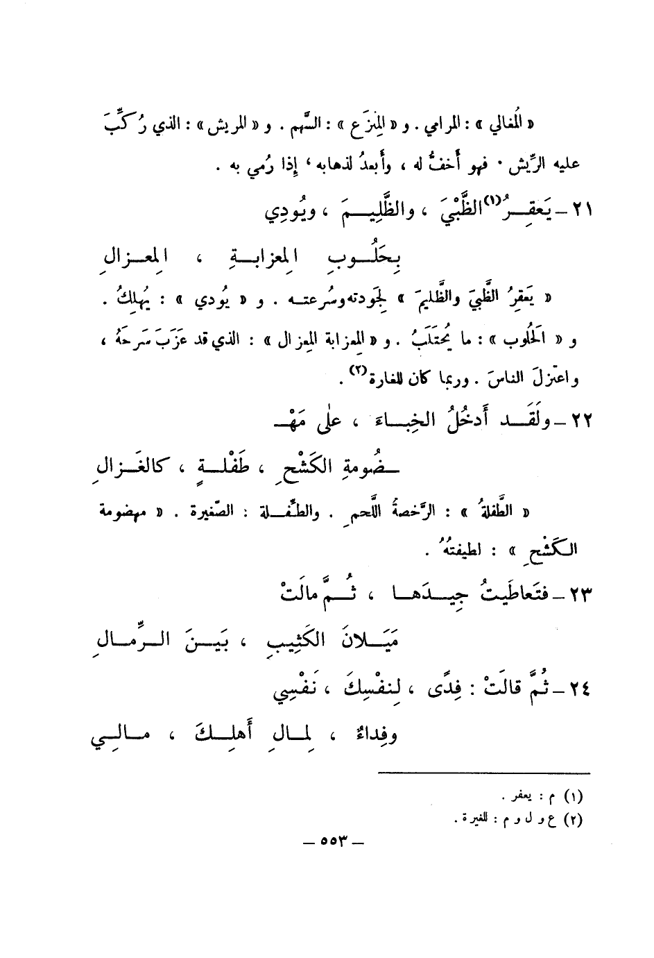 "يعقر الظبي والظليم" لجودته وسرعته. و"يودي": يهلك. و"الحلوب": ما يحتلب. و"المعزابة المعزال": الذي قد عزب سرحه، واعتزل الناس. وربما كان للغارة.