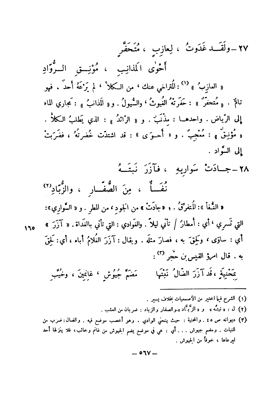 "العازب": المتراخي عنك، من الكلأ، لم يرعه أحد. فهو تام. "متحفرٌ": حفرته الغيوث، والسيول. و"المذانب": مجاري الماء إلى الرياض. واحدها: مذنب. و"الرائد": الذي يطلب الكلأ. "مؤنق": معجب. و"أحوى": قد اشتدت خضرته، فضربت إلى السواد.