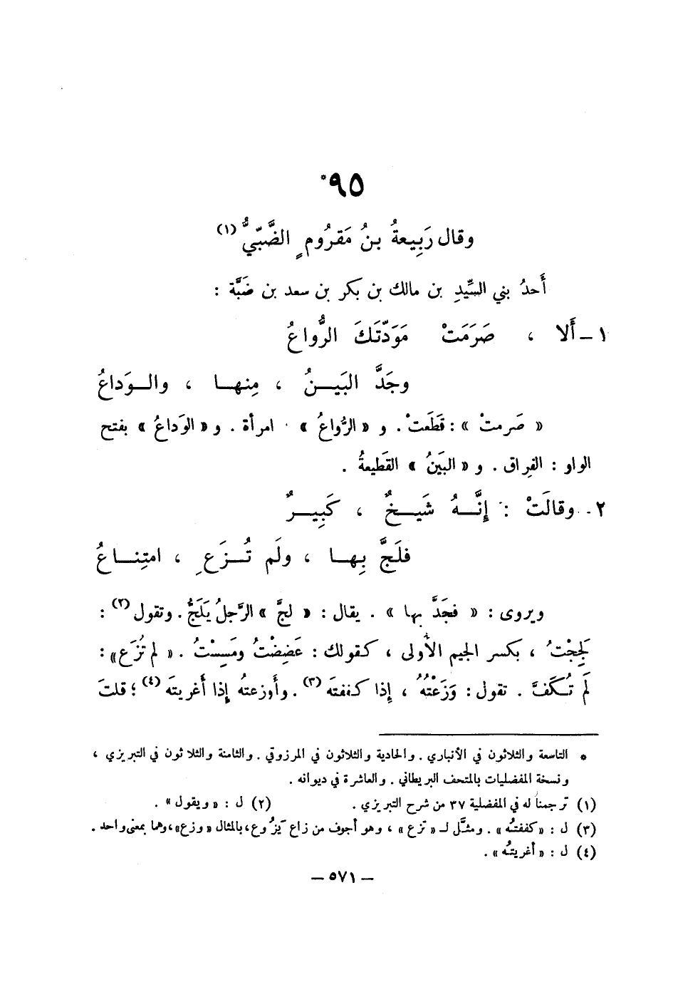 "صرمت": قطعت. و"الرواع" امرأة. و"الوداع" بفتح الواو: الفراق. و"البين" القطيعة.