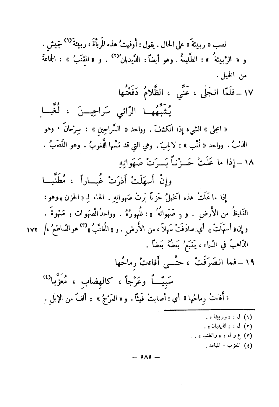 نصب "ربيئة" على الحال. يقول: أوفيت هذه المربأة، ربيئة جيشٍ. و"الربيئة": الطليعة. وهو أيضاً: الديدبان. و"المقنب": الجماعة من الخيل.
