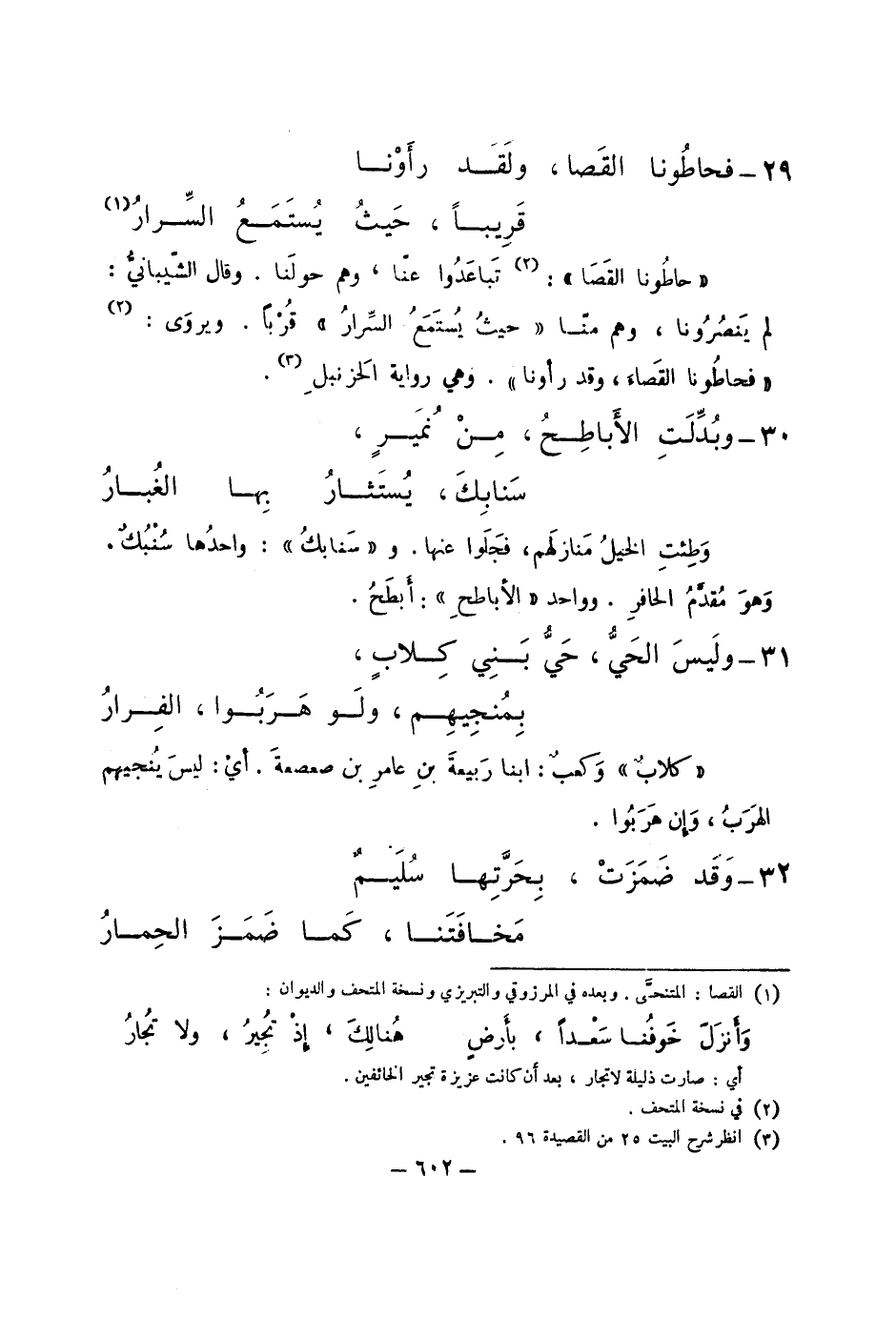 "حاطونا القصا": تباعدوا عنا، وهم حولنا. وقال الشيباني: لم ينصرونا، وهم منا "حيث يستمع السرار" قرباً. ويروى: "فحاطونا القصاء، وقد رأونا". وهي رواية الحزنبل.