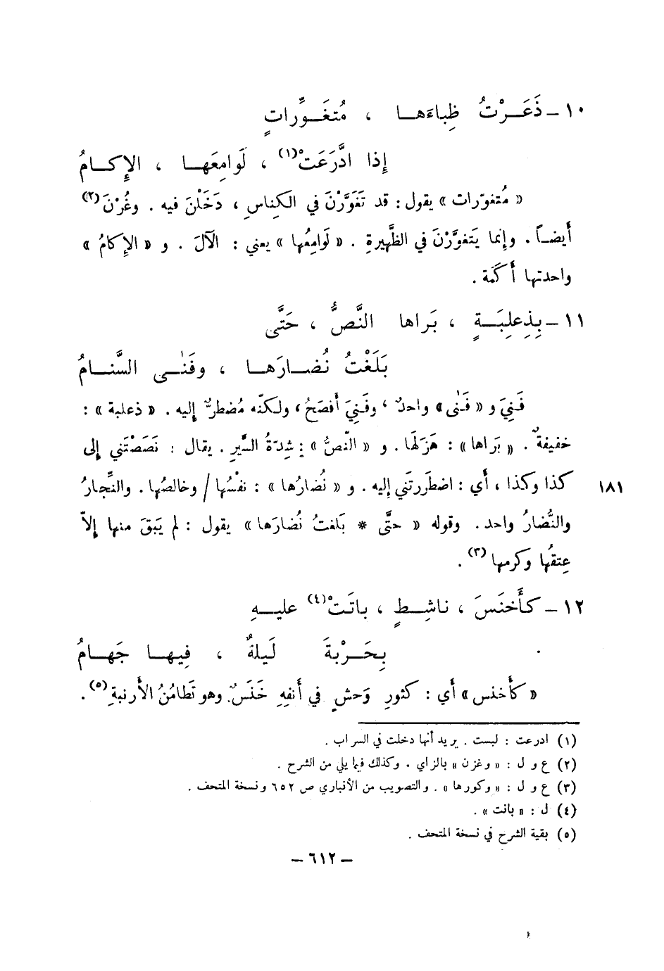 فني و"فنى" واحد، وفني أفصح، ولكنه مضطر إليه. "ذعلبة": خفيفة. "براها": هزلها. و"النص": شدة السير. يقال: نصصتني إلى كذا وكذا، أي: اضطررتني إليه. و"نضارها": نفسها وخالصها. والنجار والنضار واحد. وقوله "حتى*بلغت نضارها" يقول: لم يبق منها إلا عتقها وكرمها.