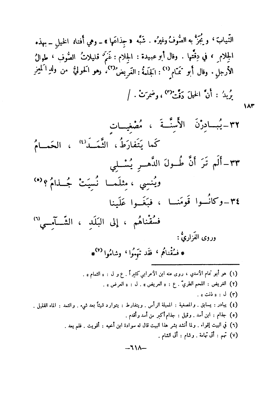 الثياب، ويجز به الصوف وغيره. شبه "جذاعها" - وهي أفتاء الخيل - بهذه الجلام، في دقتها. وقال أبو عبيدة: الجلام: غنم قليلات الصوفن طوال الأرجل. وقال أبو تمامٍ: الجلمة: الغريض. وهو الحولي من ولد المعز يري: ان الخيل دقت، وضمرت.