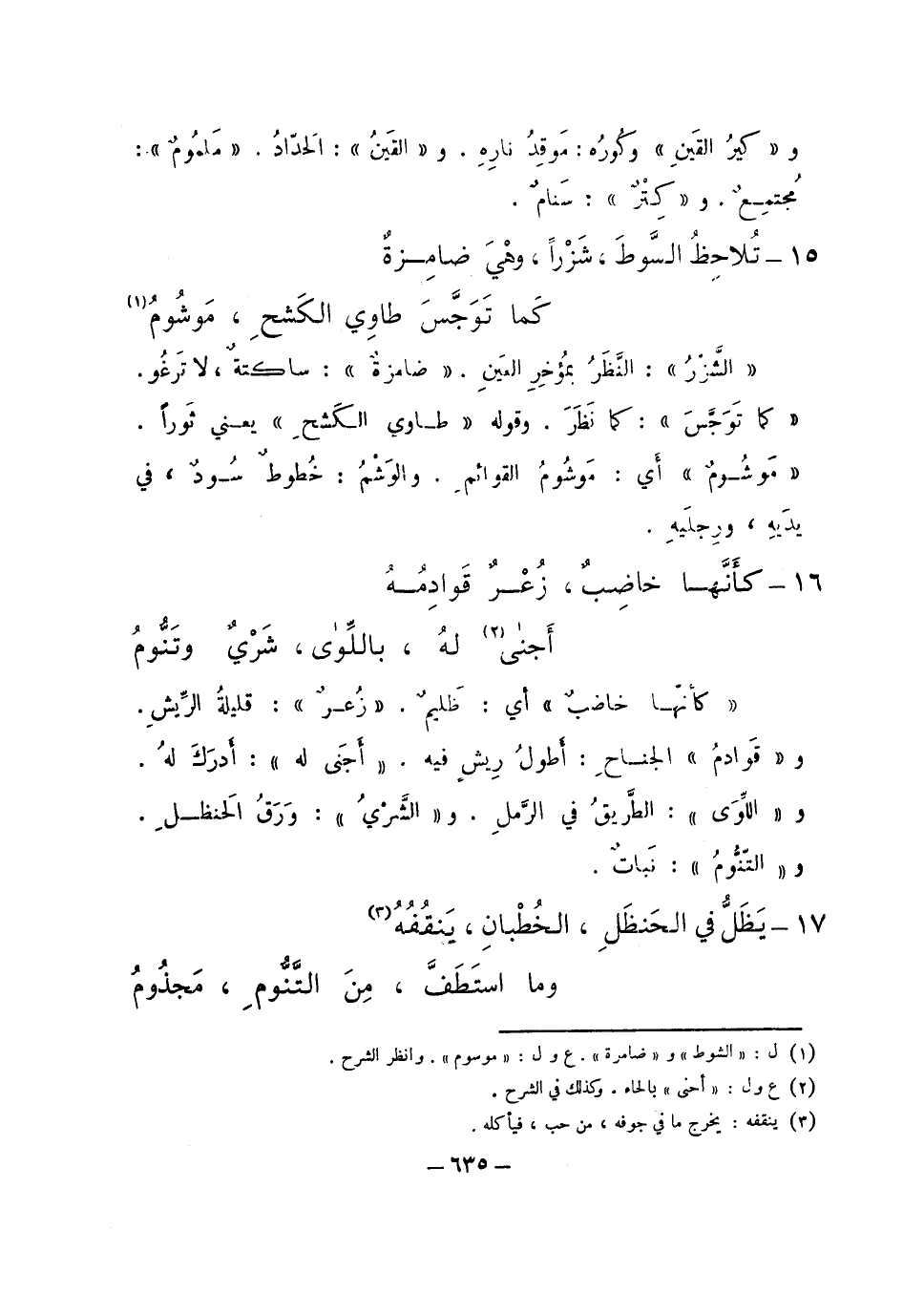 "كأنها خاضبٌ" أي: ظليم. "زعرٌ": قليلة الريش. و"قوادم" الجناح: أطول ريش فيه. "أجنى له": أدرك له. و"اللوى": الطريق في الرمل. و"الشري": ورق الحنظل. و"التنوم": نباتٌ.