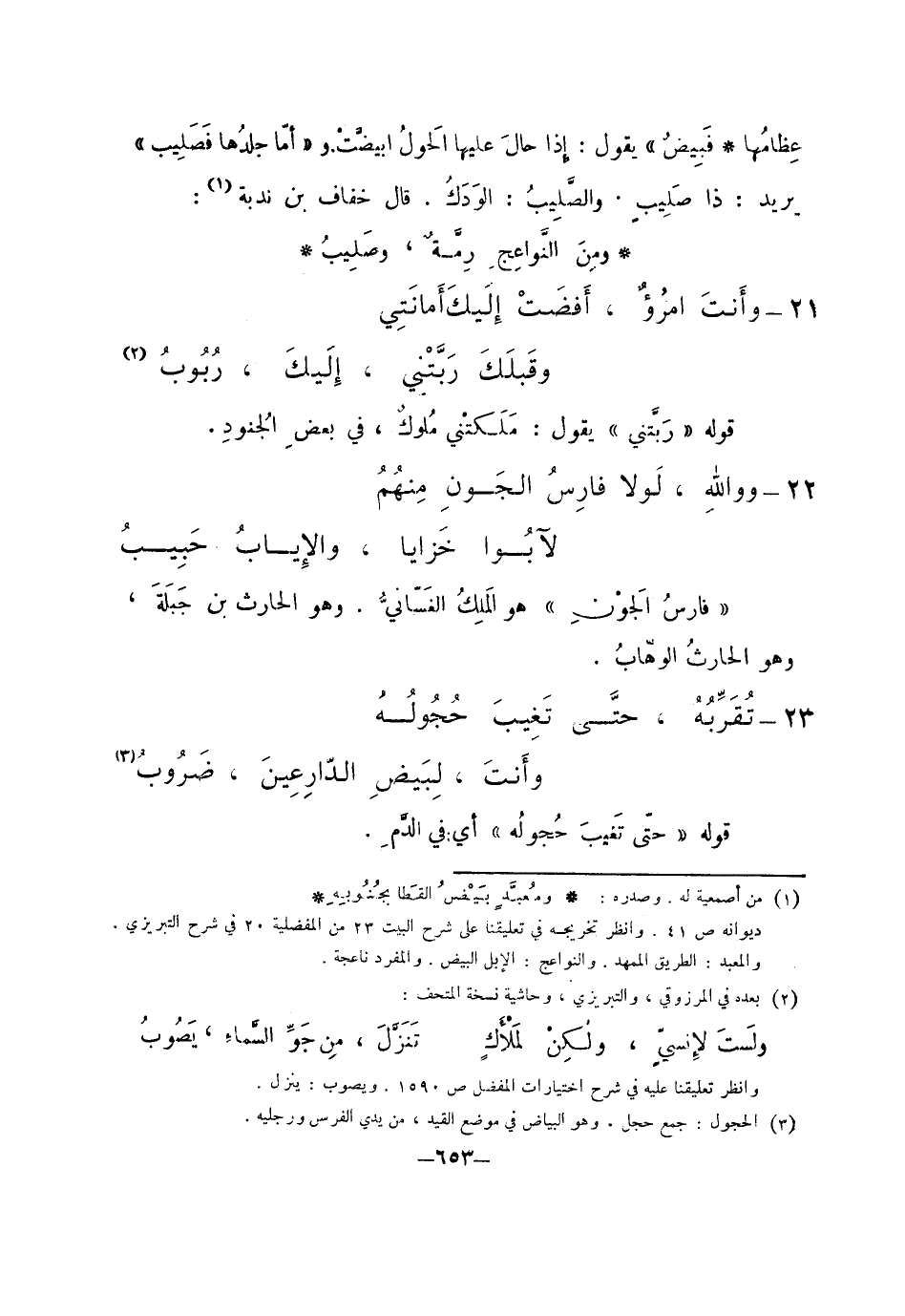 عظامها* فبيض" يقول: إذا حال عليها الحول ابيضت. و"أما جلدها فصليب" يريد: ذا صليبٍ. والصليب: الودك. قال خفاف بن ندبة: