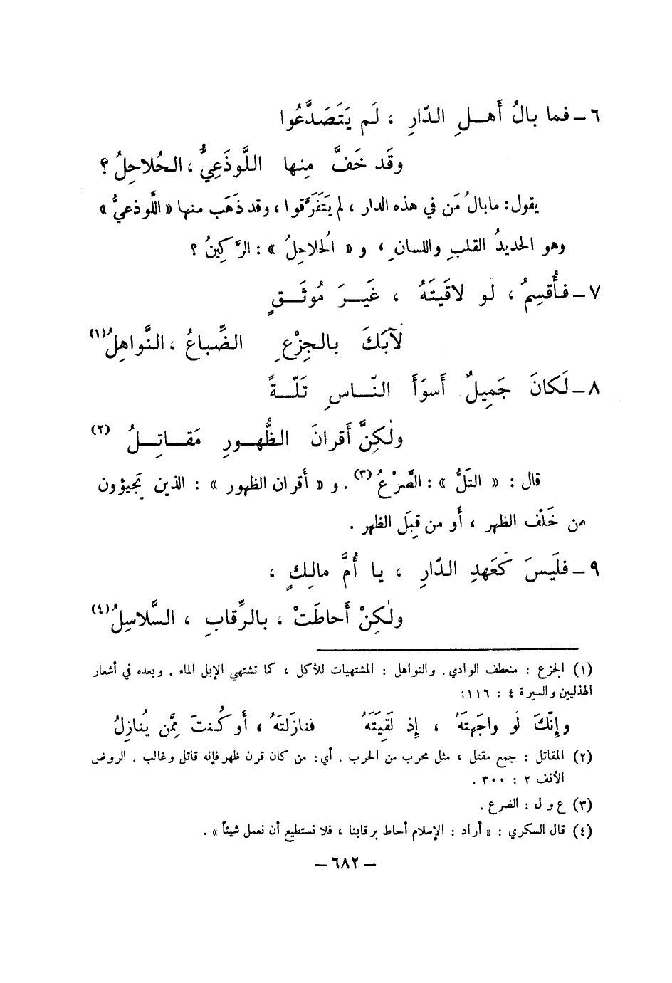 يقول: ما بال من هذه الدار، لم تفرقوا، وقد ذهب منها "اللوذعي": هو الحديد القلب واللسان. و"الحلاحل" الركين؟