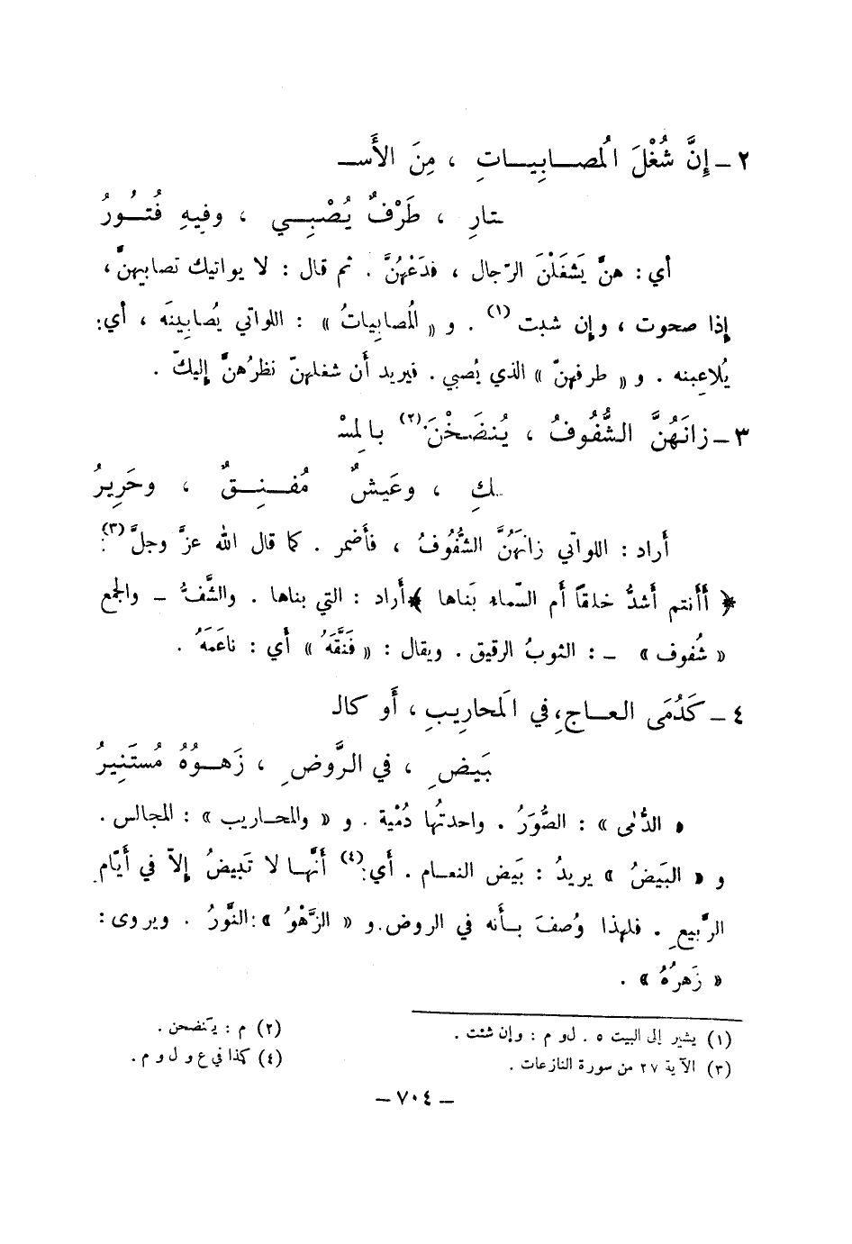 أراد: اللواتي زانهن الشفوف، فأضمر. كما قال الله عز وجل (أأنتم أشد خلقاً أم السماء بناها) أراد: التي بناها. والشف - والجمع "شفوف"- الثوب الرقيق. ويقال: "فنفه" أي: ناعمة.