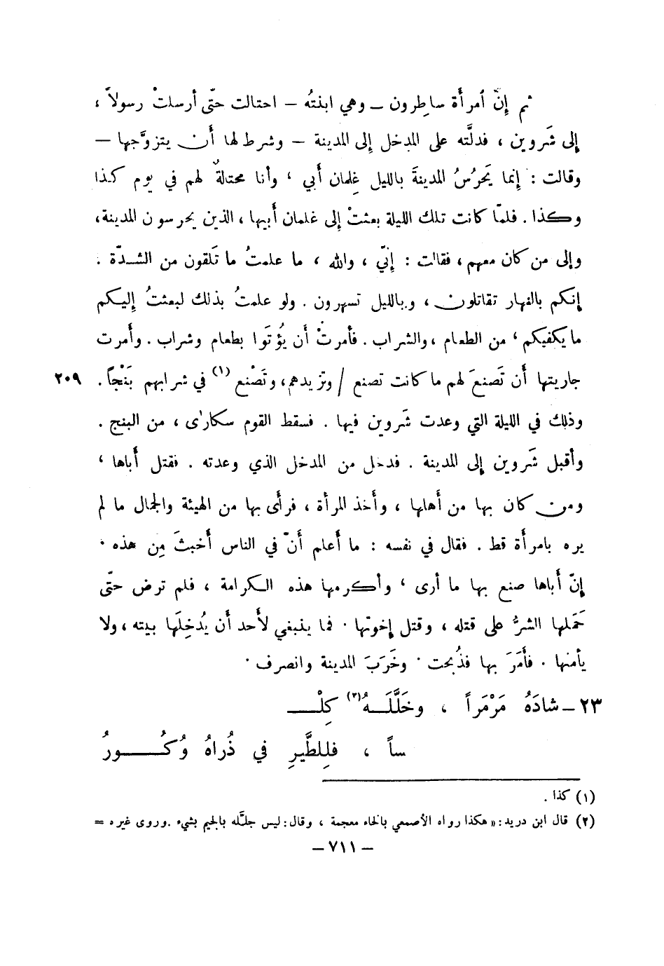 ثم إن امرأة ساطرون - وهي ابنته - احتالت حتى أرسلت رسولاً، إلى شروين، فدلته على المدخل إلى المدينة - وشرط لها أن يتزوجها - وقالت: إنما يحرس المدينة بالليل غلمان أبي، وأنا محتالة لهم في يوم كذا وكذا. فلما كانت تلك الليلة بعثت إلى غلمان أبيها، الذين يحرسون المدينة، وإلى من كان معهم، فقالت: إني، والله، ما علمت ما تلقون من الشدة، إنكم بالنهار تقاتلون، وبالليل تسهرون. ولو علمت بذلك لبعثت إليكم ما يكفيكم من الطعام، والشراب. فأمرت أن يؤتوا بطعام وشراب. وأمرت جاريتها أن تصنع لهم ما كانت تصنع وتزيدهم، وتصنع في شرابهم بنجاً. وذلك في الليلة التي وعدت شروين فيها. فسقط القوم سكارى، من البنج، وأقبل شروين إلى المدينة. فدخل من المدخل الذي وعدته. فقتل أباها، ومن كان بها من أهلها، وأخذ المرأة، فرأى بها من الهيئة والجمال ما لم يره بامرأة قط. فقال في نفسه: ما أعلم أن في الناس أخبث من هذه. إن أباها صنع بها ما أرى، وأكرمها هذه الكرامة، فلم ترض حتى حملها الشر على قتله، وقتل إخوتها. فما ينبغي لأحد أن يدخلها بيته، ولا يأمنها. فأمر بها فذبحت. وخرب المدينة وانصرف.